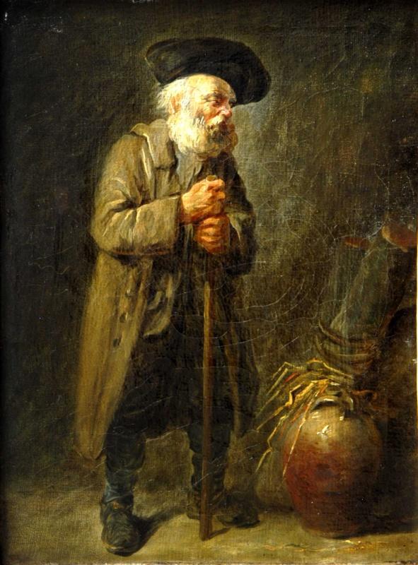 portrait (homme, mendicité, canne, cruche)