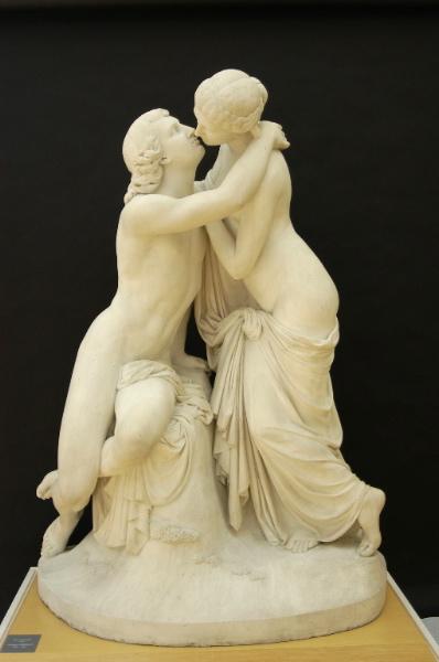 scène mythologique (mythologie gréco-romaine, Héro, jeune fille, debout, draperie, Léandre, jeune homme, assis, debout, nu, étreinte, rocher)