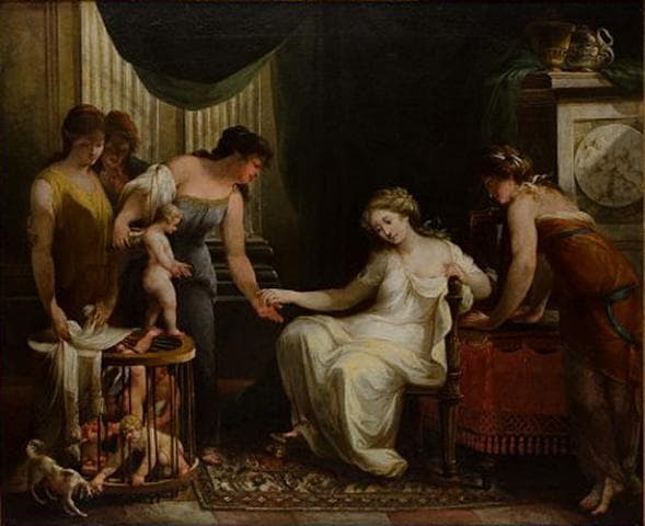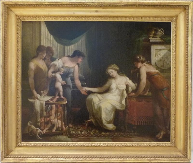 Anciennement attribué à Angélica Kauffmann. le 24/7/1972, Pierre Rosenberg doute de l'attribution à Kauffmann. En décembre 1972, Jacques Thuillier confirme qu'il ne s'agit pas d'une ouvre de Kauffmann. En juillet 1973, il affirme qu'il s'agit d'un chef-d'oeuvre de Gamelin, attribution confirmée par Sylvain Laveissière en mai 1988.