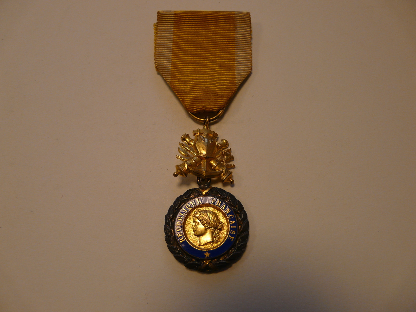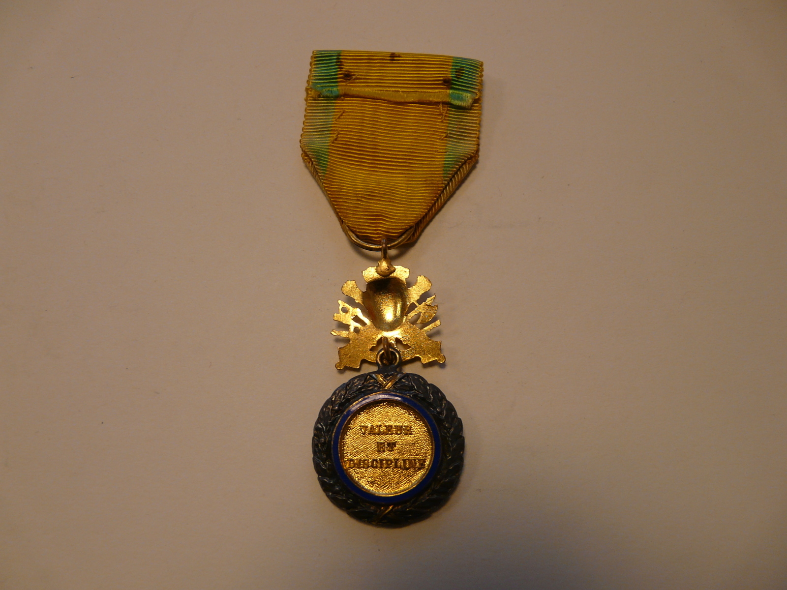 Objet. Médaille ronde portant en son centre l'effigie de Marianne dorée, entourée des mots "République Française" en or sur fond émaillé bleu. Autour, couronne de lauriers argentée. La médaille est accrochée ˆ à un emblème militaire doré représentant une cuirasse, canons et armes sur une ancre marine, lui-même fixé à un ruban jaune à liserés verts.