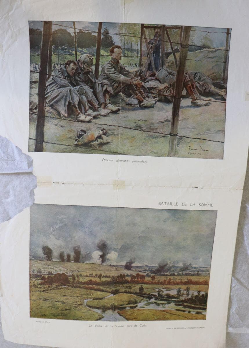 Sur chaque page, recto et verso figure une reproduction d'un tableau de François Flemeng, relatif à la bataille de la Somme. Le premier représente la vallée à proximité de Curlu. L'artiste a représenté un paysage paisible, traversé par un cours d'eau. L'inquiétude vient de l'arrière-plan d'où émergent plusieurs fumées noires s'élevant dans le ciel déjà gris. L'oeuvre est signée et datée de juillet 1916. La deuxième reproduction illustre les destructions du village de Dompierre après la bataille. Le sol est troué par les obus, il ne reste que quelques charpentes fébriles et quelques tôles qui ne mettent guère à l'abris les poilus épuisés. La troisième reproduction figure à gauche trois soldats, dont deux des colonies d'Afrique (Sénégalais ?), assis sur un mur en partie détruit. Las, le soldat de gauche ne cache pas son épuisement tandis qu'au centre un autre poilu se tient droit et semble trouver une forme de réconfort dans la pipe qu'il vient d'allumer, enfin le troisième poilu contemple le paysage détruit par la guerre. A l'arrière-plan, un paysage dévasté. Bien que peint en juillet comme l'indique l'inscription e bas à droite, l'arbre au second plan est dépourvu de feuilles. La quatrième reproduction présente derrière un périmètre de fils barbelés des soldats allemands faits prisonniers, assis à même le sol.