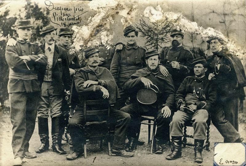 portrait commémoratif d'un groupe de soldats ayant combattu en Côte-d'Or durant la guerre de 1870, dont l'un des héros de cette guerre, Victor Curtat, qui s'est fait connaître en s'emparant le 23 janvier 1871 d'un drapeau du 61e régiment poméranien ennemi