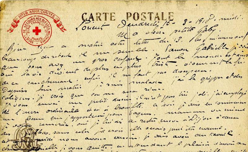 Au recto, inscription dans la représentation : SPECIMENS DES PROJECTILES / DES CANONS ALLEMANDS Au recto, numéro de série, imprimé dans la représentation, en bas à gauche : 12 Au verso, texte manuscrit, daté, signé : Lorient Vendredi 15 - 3 - 1918 midi / Ma chère petite Gaby. / Bien reçu ce matin votre lettre du 13. les miennes ont / beaucoup de retard il me semble.(?) Gabrielle, je vois / que vous avez un gros cafard. Tout le monde est ainsi / où la vie devient de plus en plus triste. Vivement la fin de ce cauchemard. enfin il ne faut pas désespérer. / Depuis hier matin, je suis malade. / j'ai la grippe et des / coliques. je crois que ça ne sera rien. Je vous envois un petit dessin, il n'est pas très joli. J'ai employé / de l'encre ordinaire et en à brouilli. Ce soir je vais en commencer / un beau que j'apporterais pour Pâques. maman va mieux / je vous remercie. oui je lui dis rester à Dijon à cause / des gothas sans cela je crois elle serais peut être revenue. / Cet après midi, nous avons vaccin. je sais avoir du travail / chère gabrielle je vous quitte en attendant le plaisir d'avoir de / vos nouvelles. recevez ainsi que votre maman mes meilleures amitiés. / Bonnes pensée / NOIROT Au verso, tampon et bannière imprimée à l'encre rouge, en haut à gauche, sigle : INTER ARMA CARITAS / SOCIETE DE SECOURS AUX BLESSES MILITAIRES / 21, RUE FRANÇOIS III PARIS