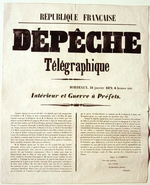 Titre, date et texte, au recto, en deux colonnes, en encre noire : REPUBLIQUE FRANCAISE / DEPECHE / Télégraphique / BORDEAUX, 31 janvier 1871, 6 heures soir. / Intérieur et Guerre à Préfets. / Aucune réponse n'a encore été faite à la dépêche qui a été envoyée hier / à Versailles, à M.J. Favre, et dont communication vous a été faite. La seule / réponse reçue par la délégation est de M. de Bismark. Il en résulte que l'ar / mistice conclu le 28 durera jusqu'au 19 février ; la ligne de démarcation sépa- / rant les deux armées part de Pont-l'Evêque, traverse le département de l'Orne, / l'Aisne à l'occupation allemande, la Sarthe, Indre-et-Loire ; Loir-et-cher, Loi- / ret, Yonne, traverse la Côte-d'Or, le Doubs et le Jura. Le Nord, le Pas-de-Calais / et le Havre restent intacts. Les opérations dans la Côte-d'Or, le Doubs et le Jura / et le siège de Belfort continuent jusqu'à une entente ultérieure. Reddition de toutes les foritification de Paris, l'armée de Paris prisionnière de guerre, moins / une division conservée pour le service intérieur. La garde nationale reste ar- / mée, lers troupes allemandes n'entreront pas dans Paris pendant l'armistice ; / Paris ravitaillé, circulation libre pour les élections. / M. de Bismark ajoute que les forts ont été occupés hier par l'armée / allemande ; d'autre part, le général Chanzy a reçu hier du prince Frédéric- / Charles communication d'un texte de la convention de Versailles. L'article / premier dit que l'armistice commencera à Paris le même jour ; dans les / départements, dans un délai de trois jours. Cet armistice s'applique aux / forces navales et les prises faites après le 28 janvier seront rendues. Il sera / procédé à l'échange de tous les prisonniers de guerre faits depuis le com- / mencement de la guerre par l'armée française. Paris paiera une contribution / de deux cent millons. De tout cela il résulte que rien n'a été stipulé sur / les questions de paix ou de guerre qui demeurent réservées à l'Assemblée / convoquée à Bordeaux. D'autre part, qu'entre l'armistice pur et simple annoncé / par la dépêche de Versailles et signé J. Favre et la convention communiquée / par le prince Frédéric-Charles et analysée par M. Bismark, il existe une / divergence grave en ce qui touche les opérations dans l'Est. / Comme la dépêche signée Jules Favre annonçait l'armistice sans indiquer / de délai et sans dire s'il était général ou partiel, et enjoignait de le faire exé- / cuter immédiatement, les deux ministres de la guerre et de la marine ont en- / voyé aussitôt des instructions et des ordres aux généraux en chef de corps, / commandants de stations navales, pour faire respecter l'armistice, et l'exécution / de ces ordres a commencé depuis quarante-huit heures. / Cependant les / armées prussiennes, sans doute mieux instruites des termes de la convention, / ont continué leur mouvement et pris des positions, malgré la résistance et les / protestations de nos chefs de corps. La délégation, qui n'a, on le voit, reçu sur / la convention de Versailles d'autre document officiel français que le télégramme / de Versailles, signé Jules Favre, a le droit et le devoir de porter ces faits à la / connaissance du pays, afin de faire porter sur qui de droit la responsabilité qui / incombe à ceux qui n'ont pas fait connaître la convention dans toute sa teneur / et ont entraîné des erreurs d'interprétation dont les conséquences, au point de / vue de notre héroïque armée de l'Est, peuvent être irréparables pour la France. Signature, en bas à droite du recto, en encre noire : L. GAMBETTA. Inscription concernant le destinataire, en bas à droite du recto, en encre noire : Pour copie conforme : / Pour le préfet, / Le Secrétaire général, / NICOLIN.