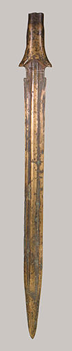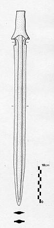 Type en langue de carpe. Lame à bords rectilignes présentant, à partir du tiers inférieur, un brusque rétrécissement. La lame est renforcée par une forte nervure médiane ayant tendance à s'atténuer à proximité de la pointe. Le ricasso est très accentué. Une poignée de Bronze, actuellement brisée au niveau du pommeau, a été coulée sur la lame comme l'a prouvé la radiographie. Celle-ci montre en effet que cette lame était initialement pourvue d'une languette percée de cinq trous de rivets permettant la fixation d'une poignée en matière organique