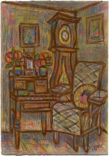 L'intérieur de la maison de Rouvrat : l'horloge au coin du mur; de part et d'autre, un bureau et un fauteuil