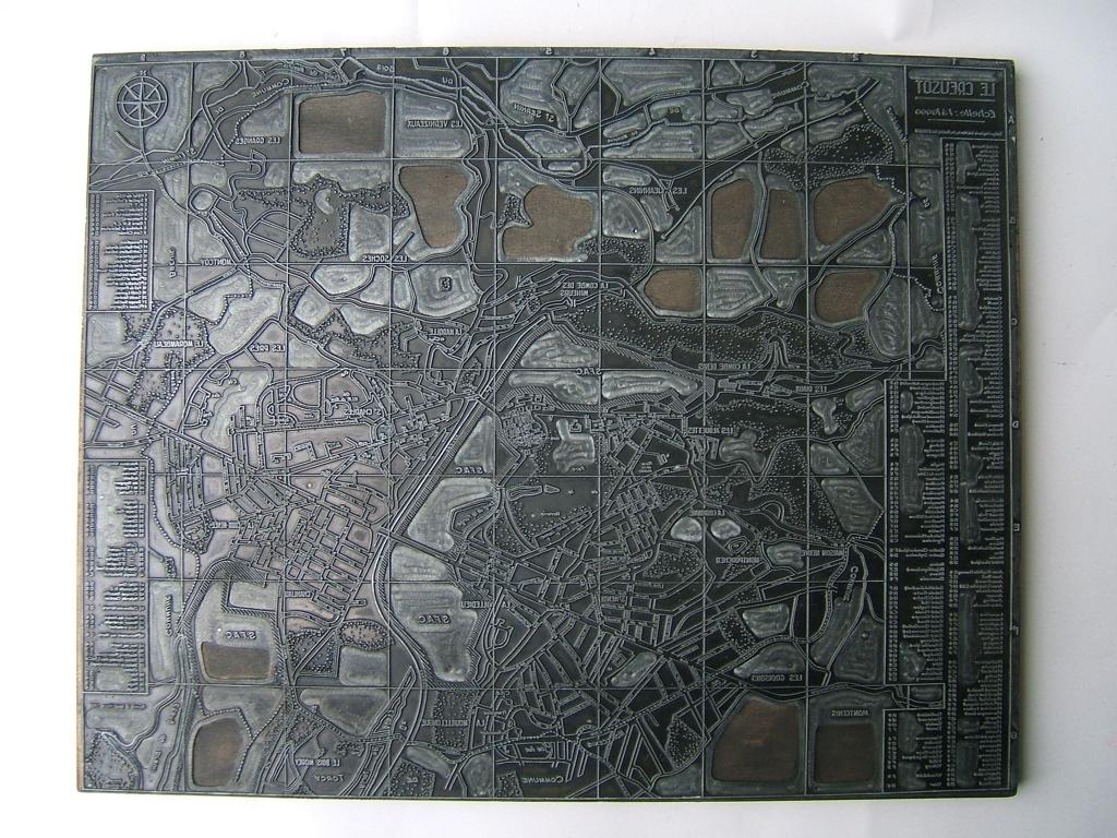 planche à imprimer dont la face principale présente un plan de la ville du Creusot