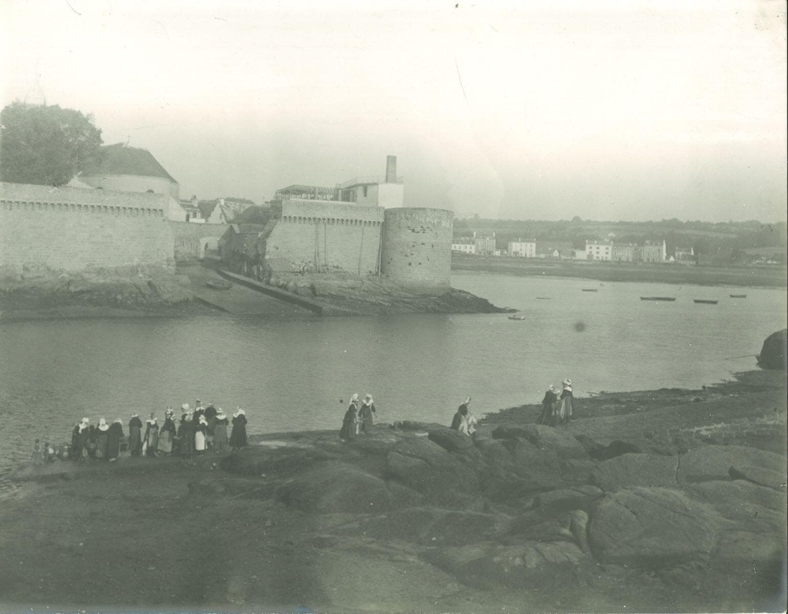 Les femmes portent coiffe et col. Des enfants sont sur les rochers au bord de l'eau.. Tirage sur papier au gélatino-bromure d'argent