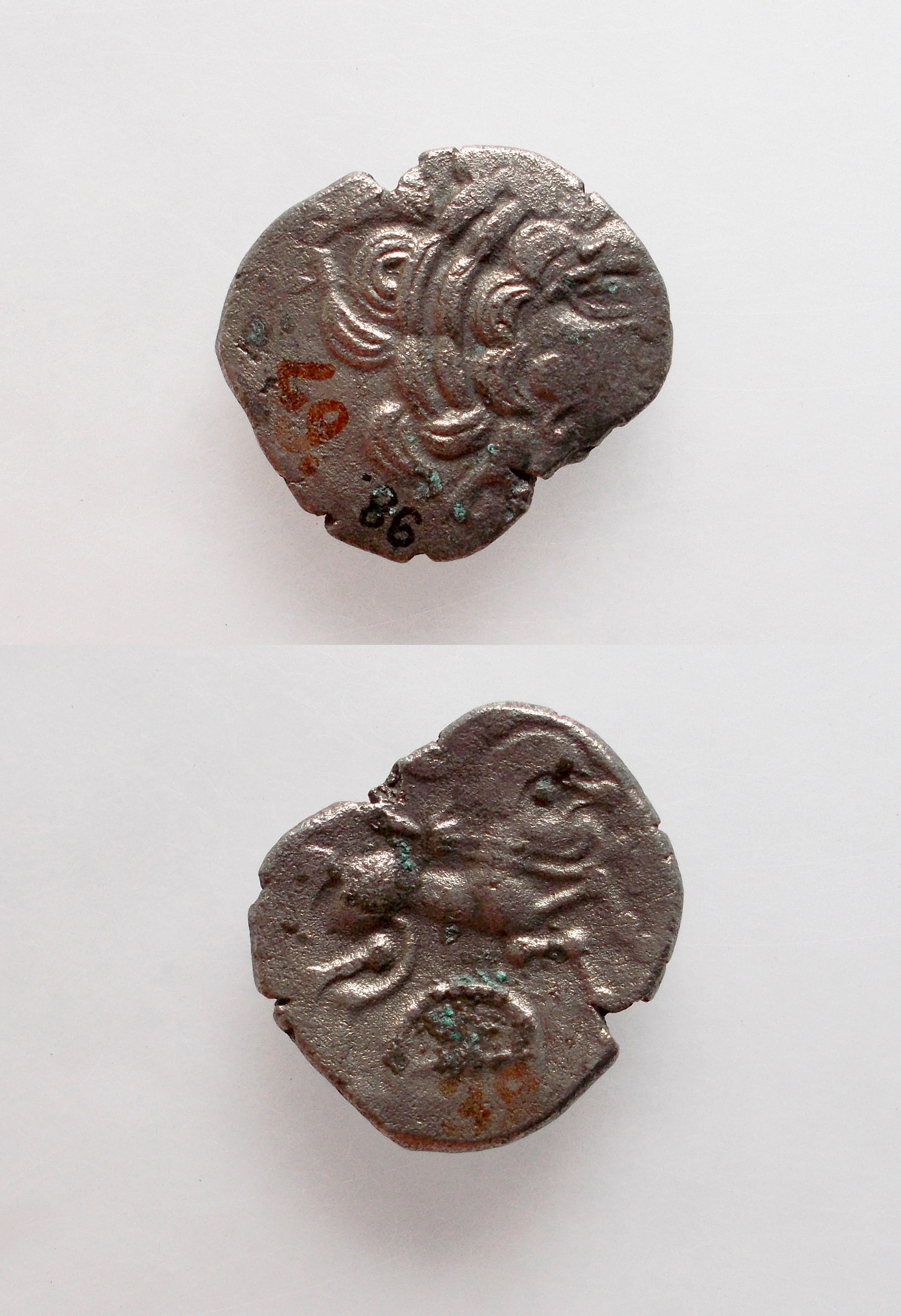 Statère des Riedones à la roue à 4 rayons (classe 4) ; Tête humaine à droite ; Cheval androcéphale à droite, conduit par un aurige. Sous le cheval, une roue à quatre rayons