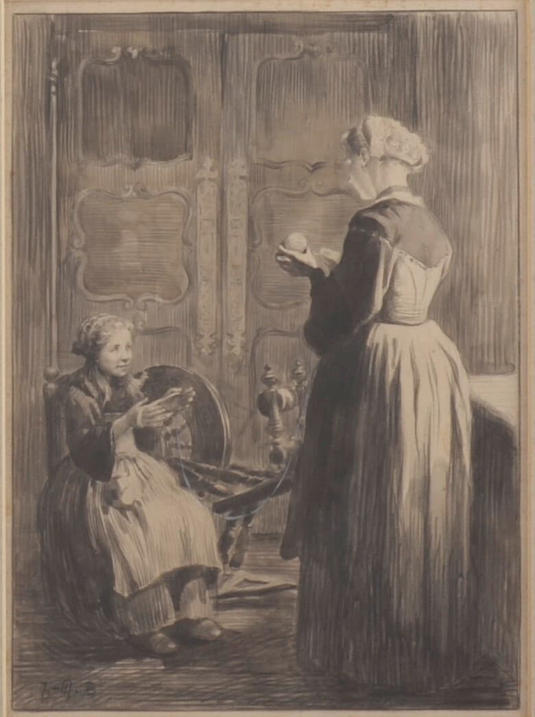 Jeanne-Marie Barbey représente ici une femme et une fillette en train de filer la laine dans un intérieur breton des environs de Gourin.