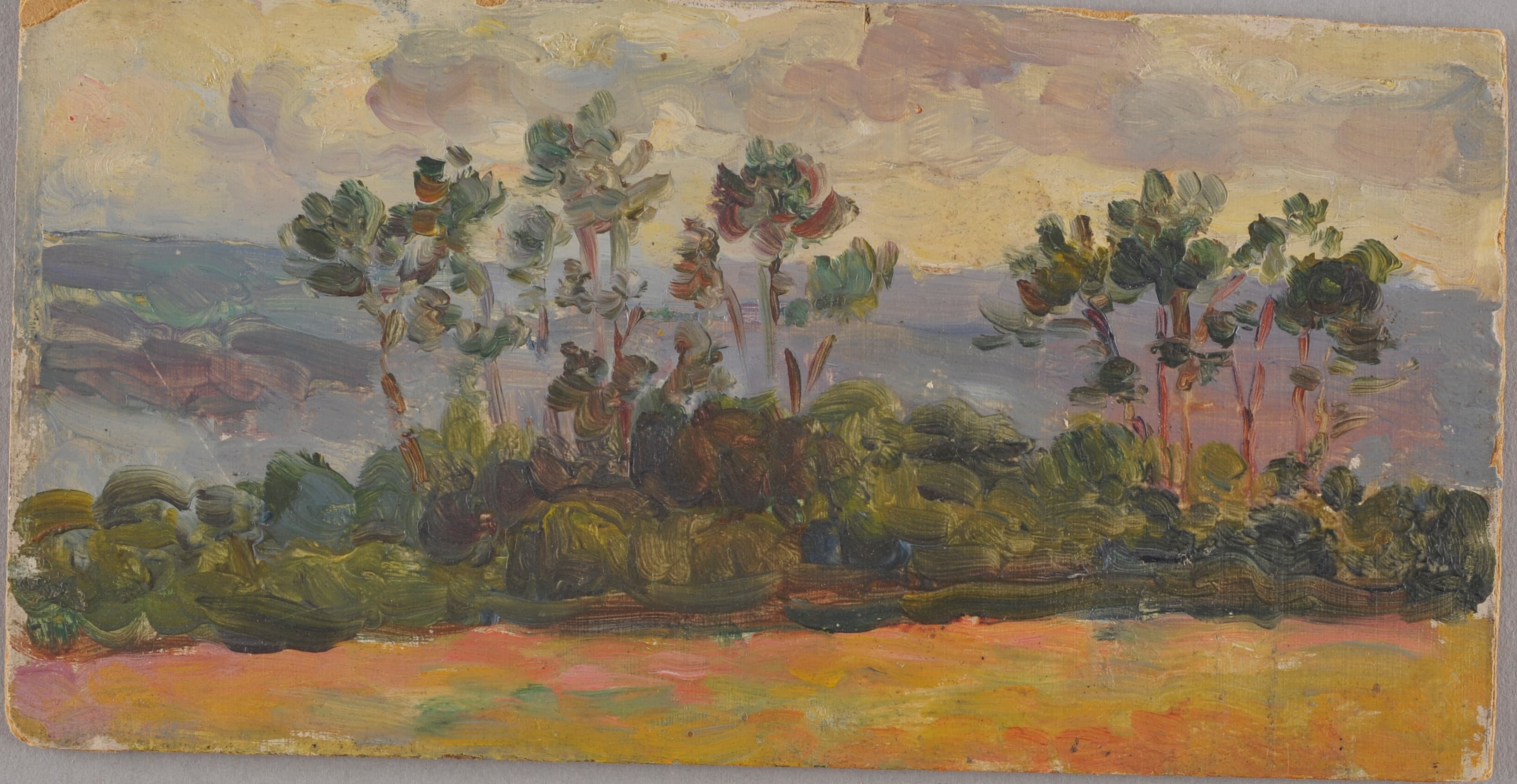 Cette oeuvre représente probablement les Montagnes Noires, dans les environs de Gourin où Jeanne-Marie Barbey passe ses vacances estivales. Elle séjourne à l'hôtel de la Croix Verte, propriété de son frère Auguste. Les paysages de landes occupent une grande place dans son oeuvre.