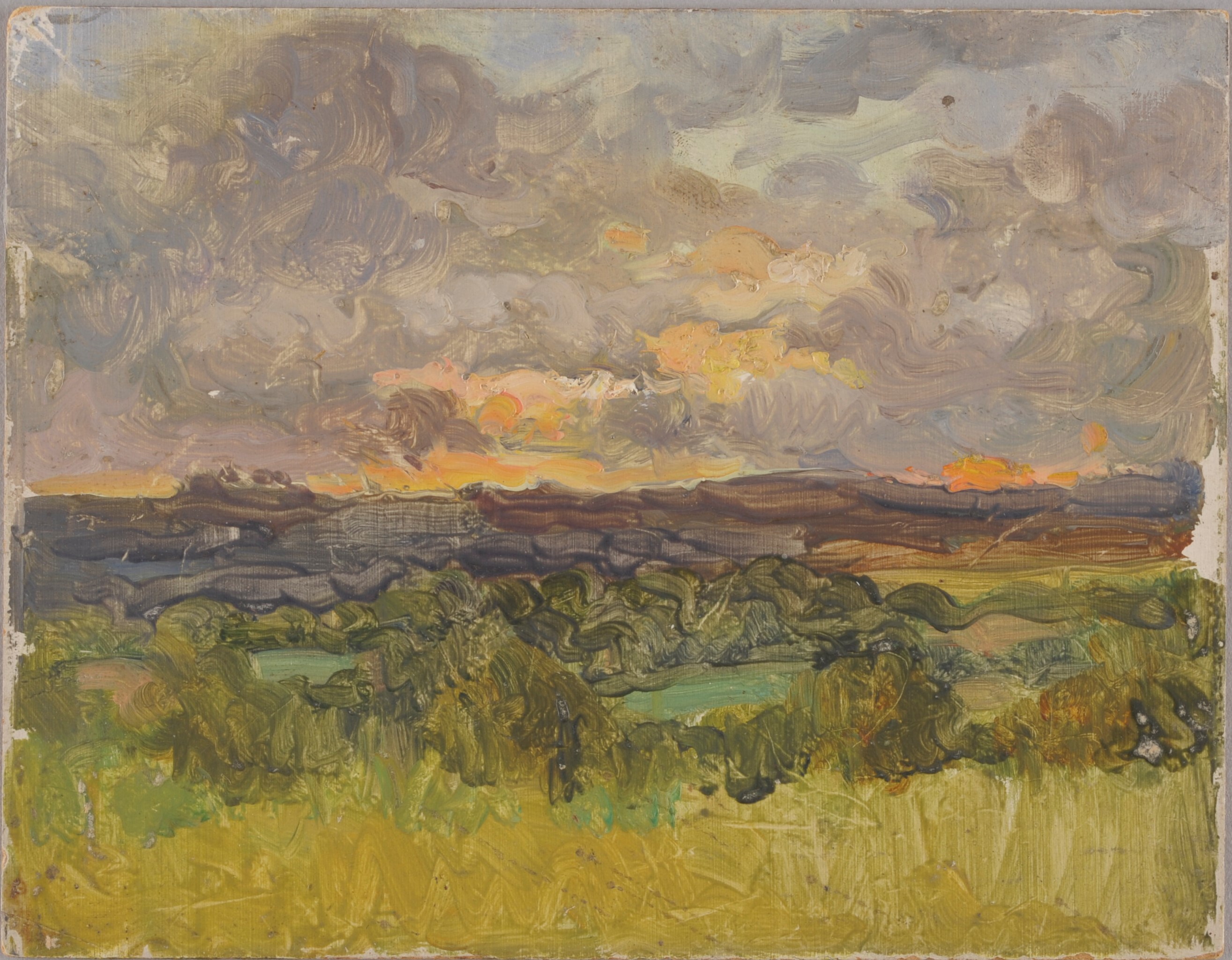 Cette oeuvre représente probablement les Montagnes Noires, dans les environs de Gourin où Jeanne-Marie Barbey passe ses vacances estivales. Elle séjourne à l'hôtel de la Croix Verte, propriété de son frère Auguste. Les paysages de landes occupent une grande place dans son oeuvre.