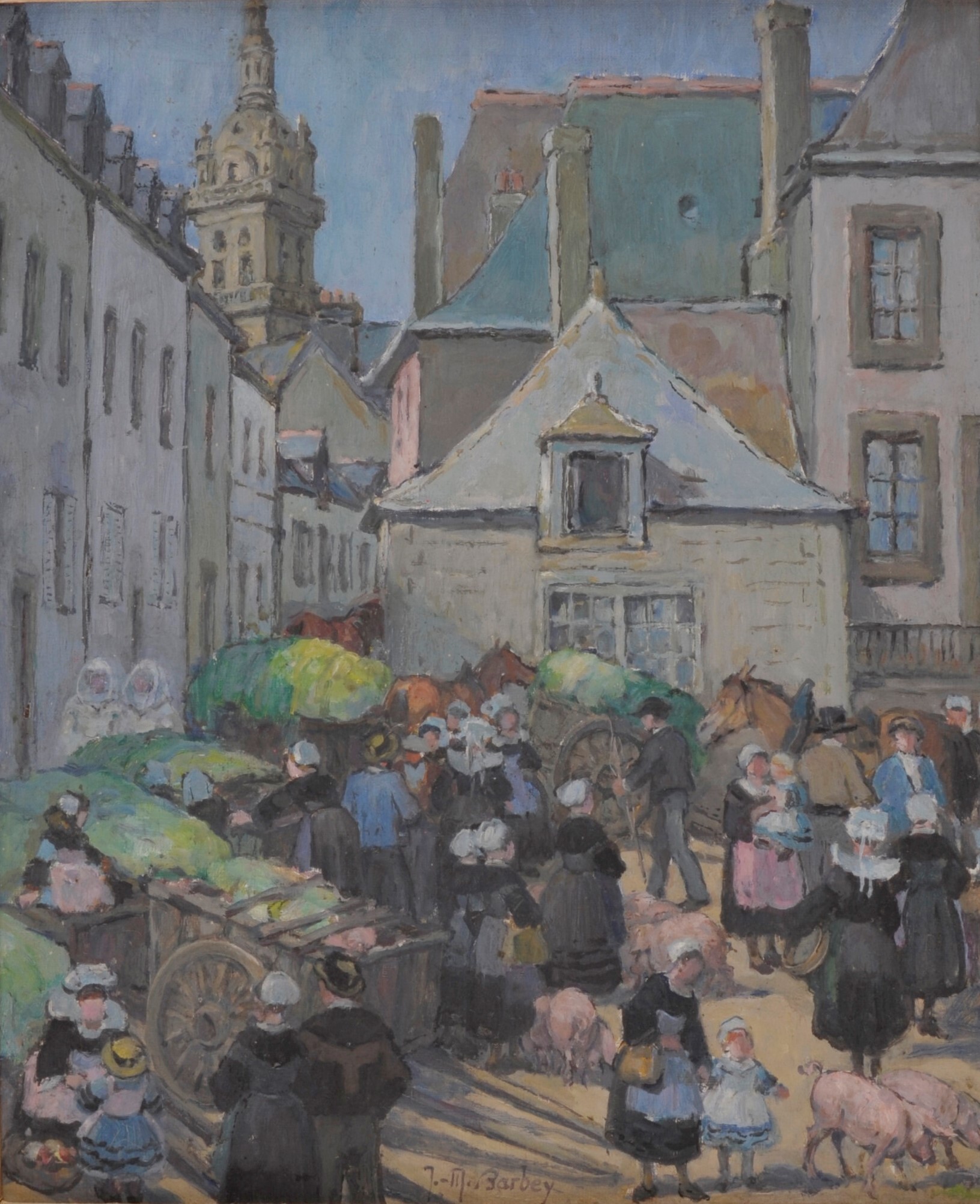 Scène de genre ; marché ; cheval ; cochon ; homme ; femme ; enfant ; costume traditionnel breton ; coiffe ; tablier ; sabot ; charrette ; maison ; église ; clocher ; religieuse