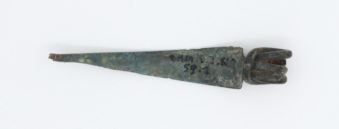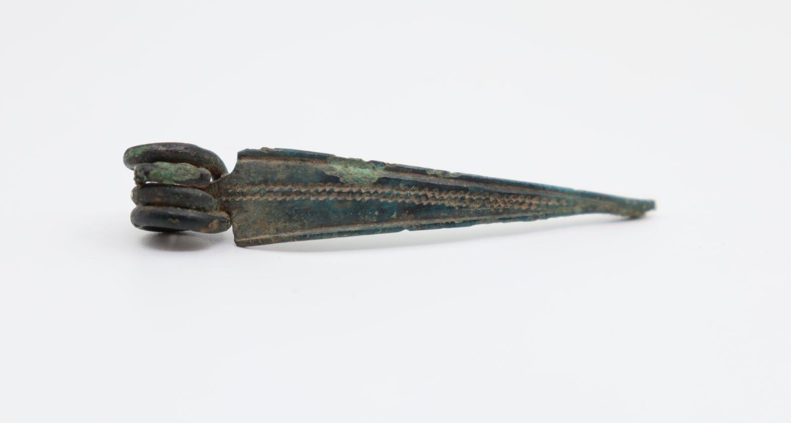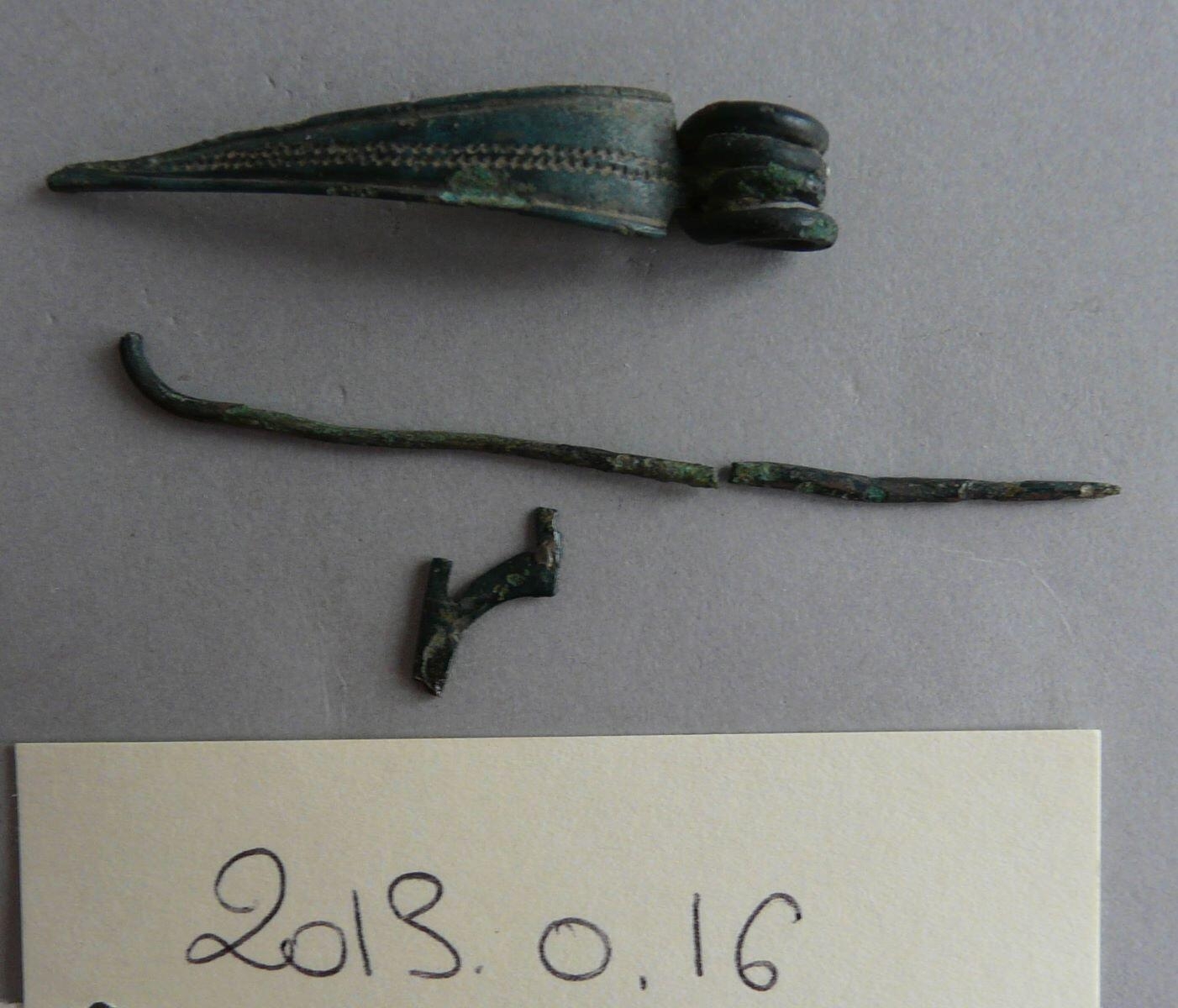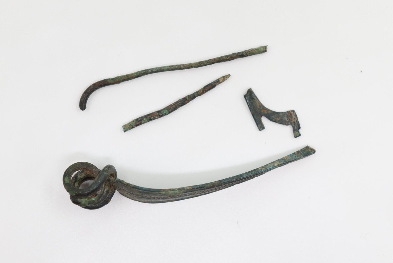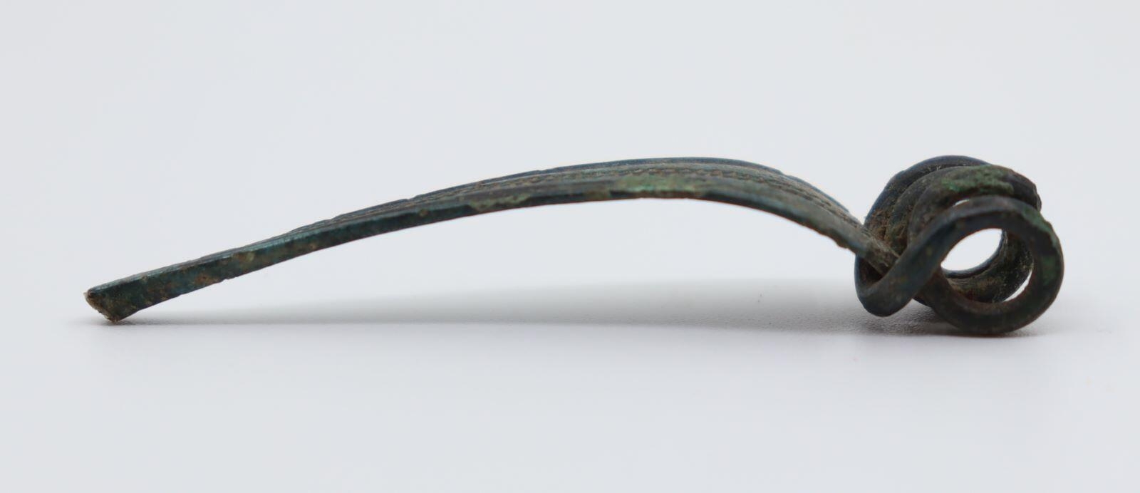 fibule de Nauheim. fibule produite en Germanie, atelier de Nauheim. Elle possède un ressort et un ardillon détaché de l'arc. Ceui-ci est ornée de décors stylisés.