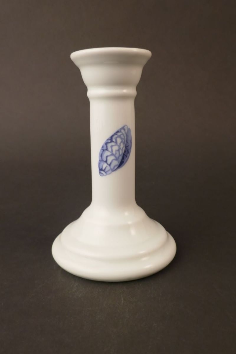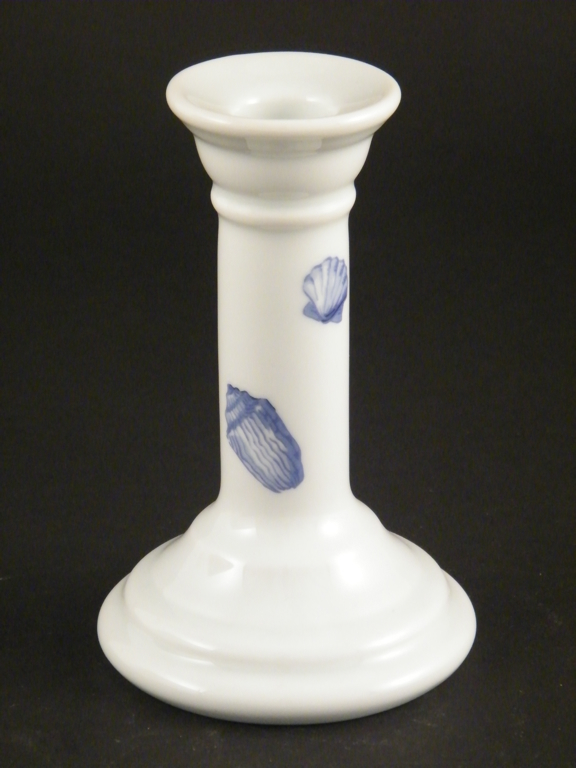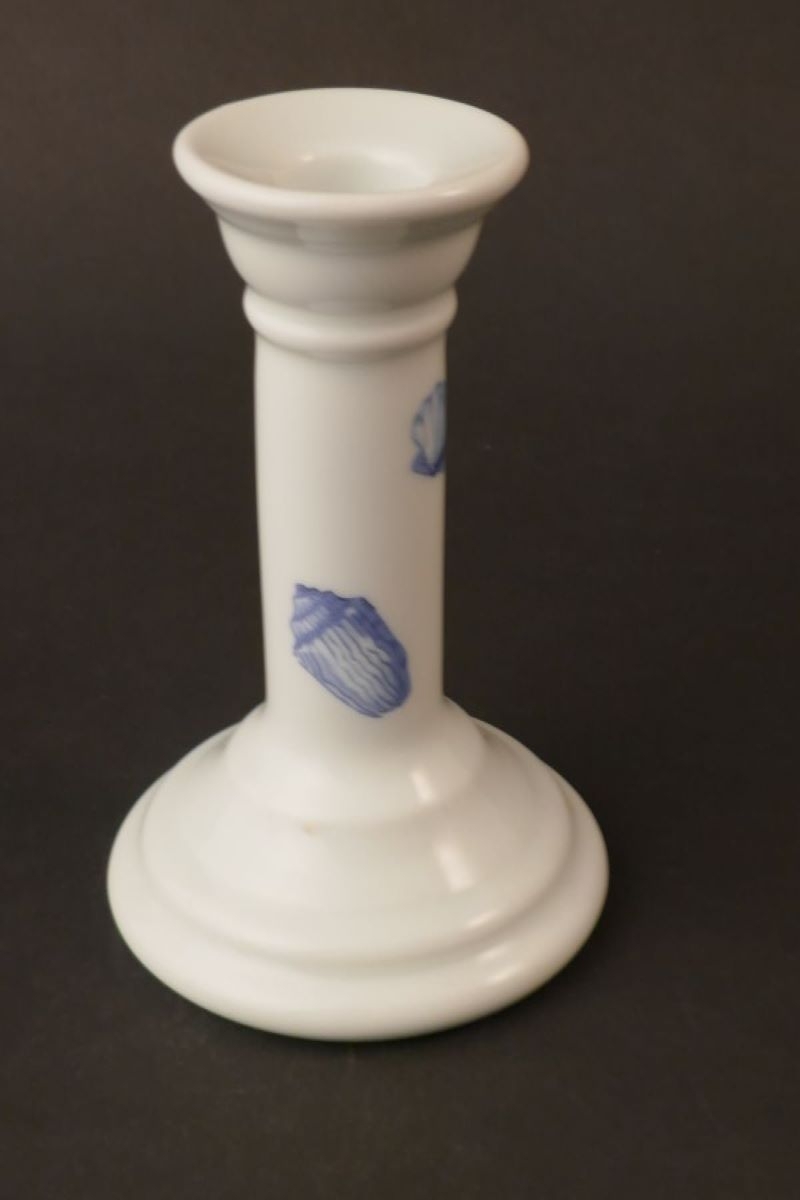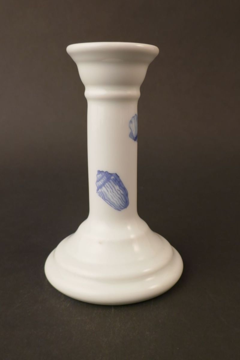 Bougeoir à pied, fond blanc et motifs de coquillages bleus.