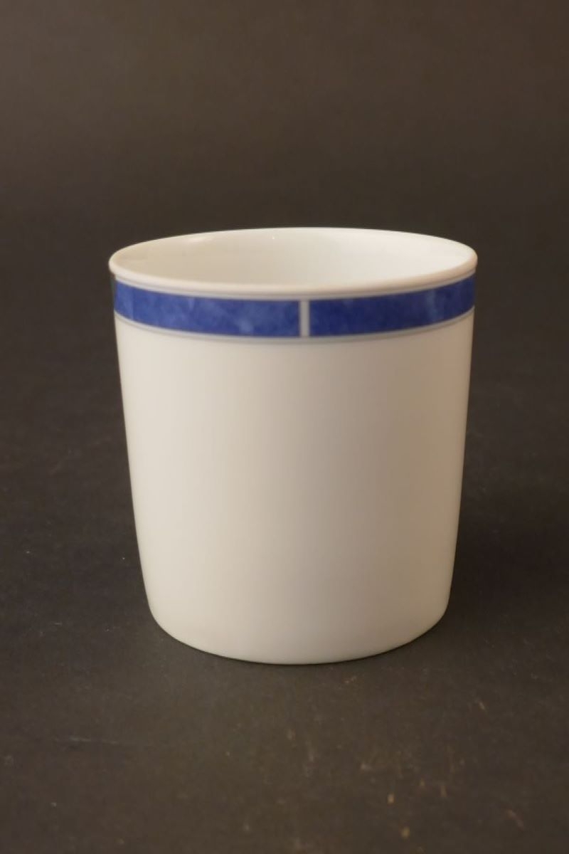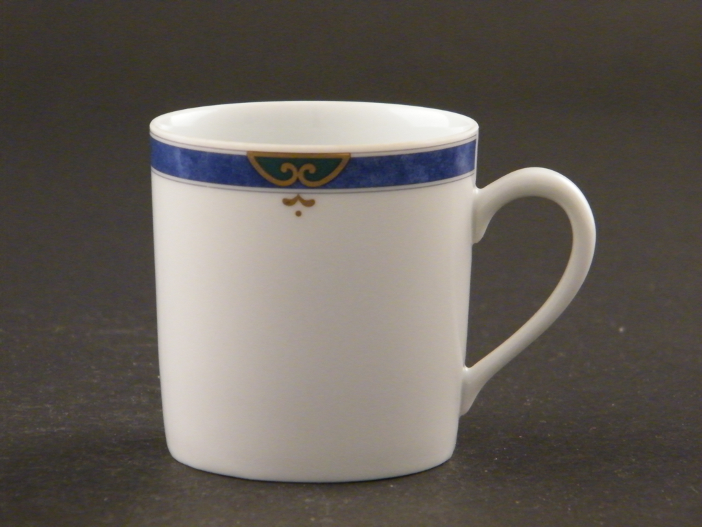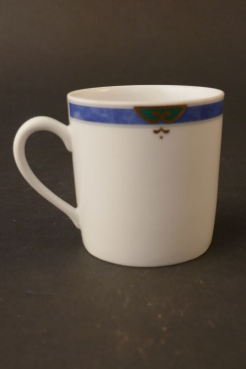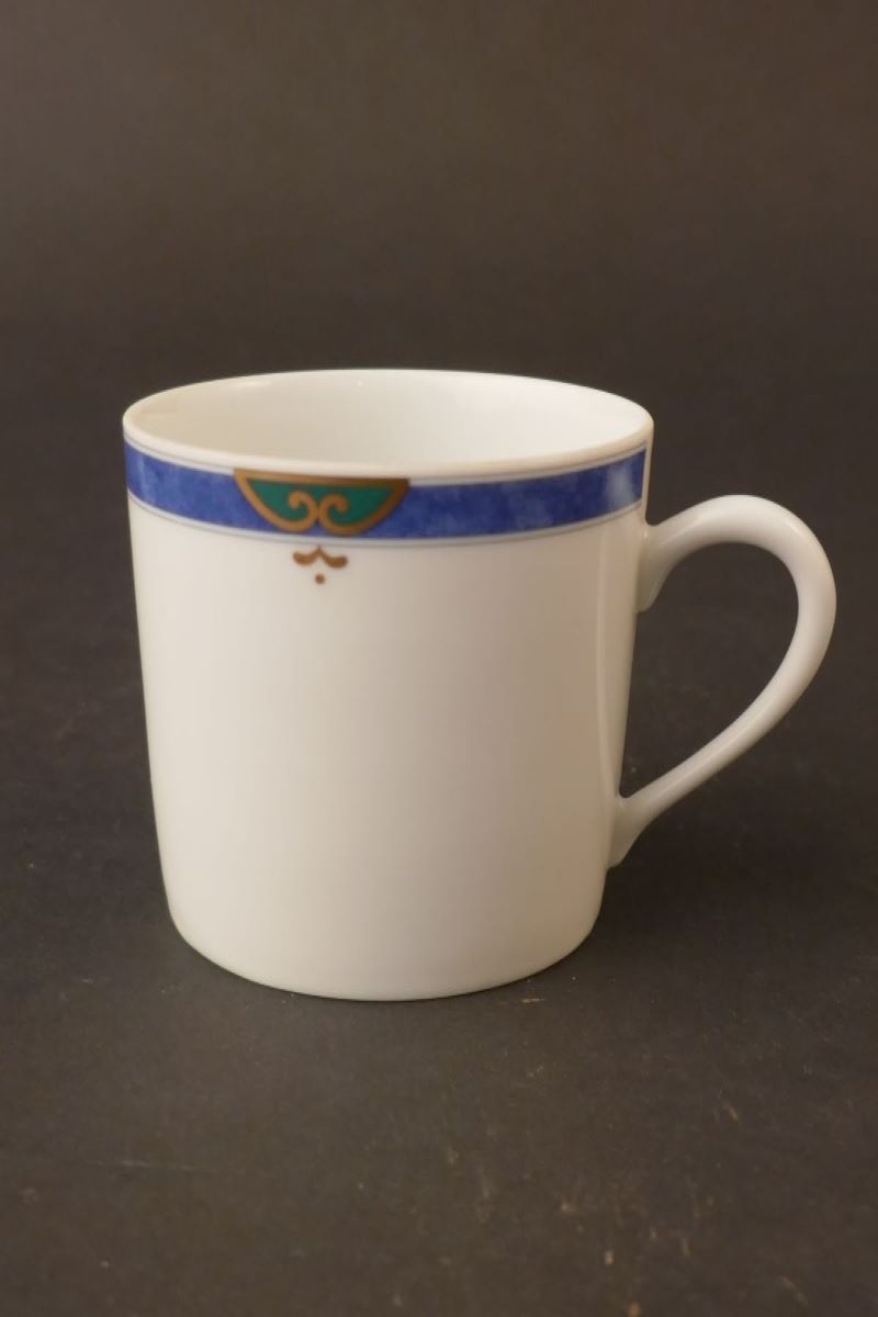 Tasse avec anse, fond blanc avec une frise bleue et motifs verts de fleur de lys.