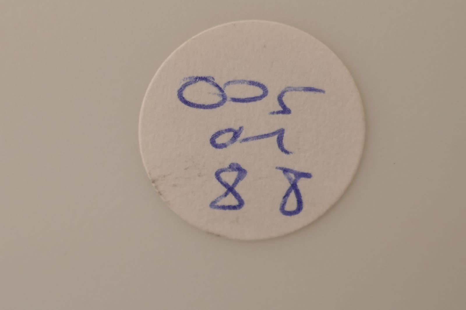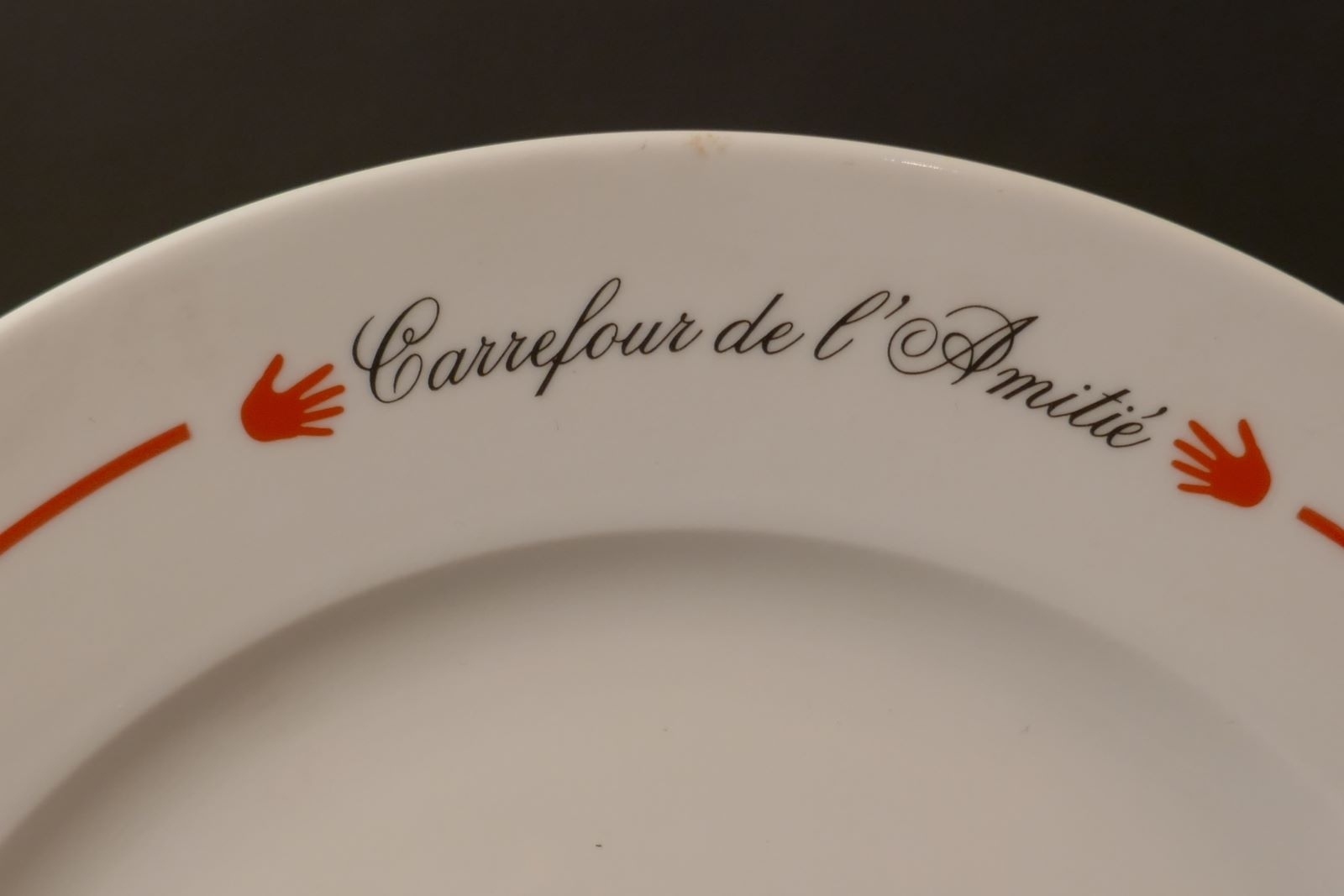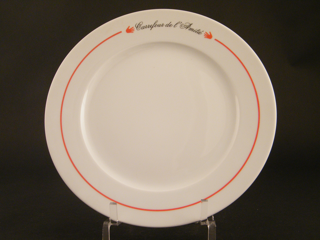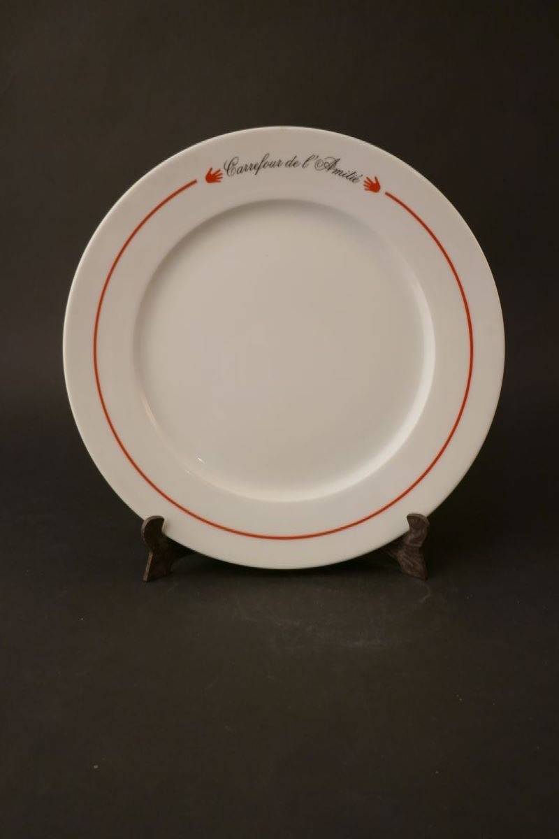 Assiette plate et circulaire, fond blanc avec un liseré rouge, deux mains et une inscription.