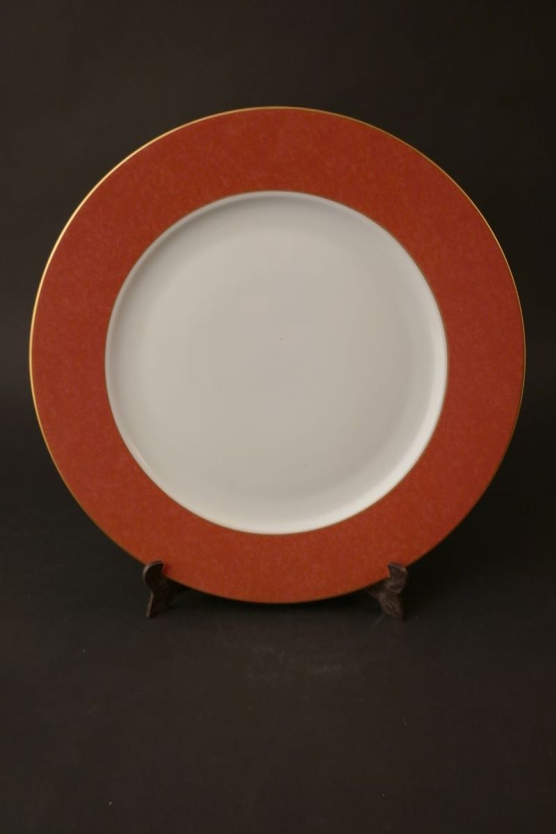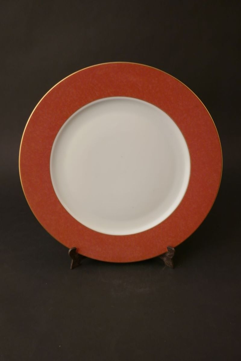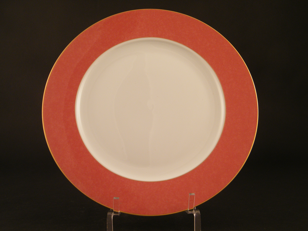 Assiette plate, fond blanc avec un liseré doré et un contour rouge.