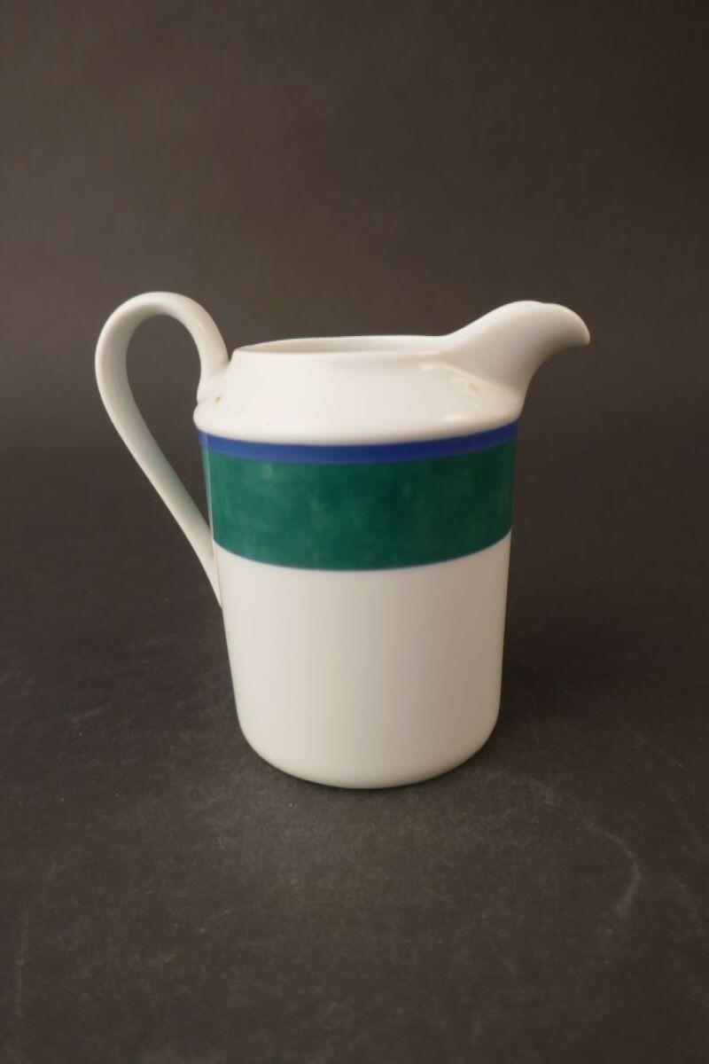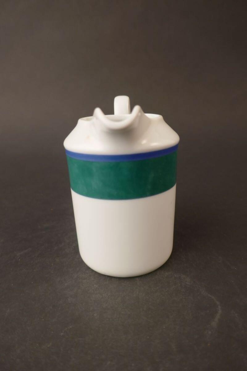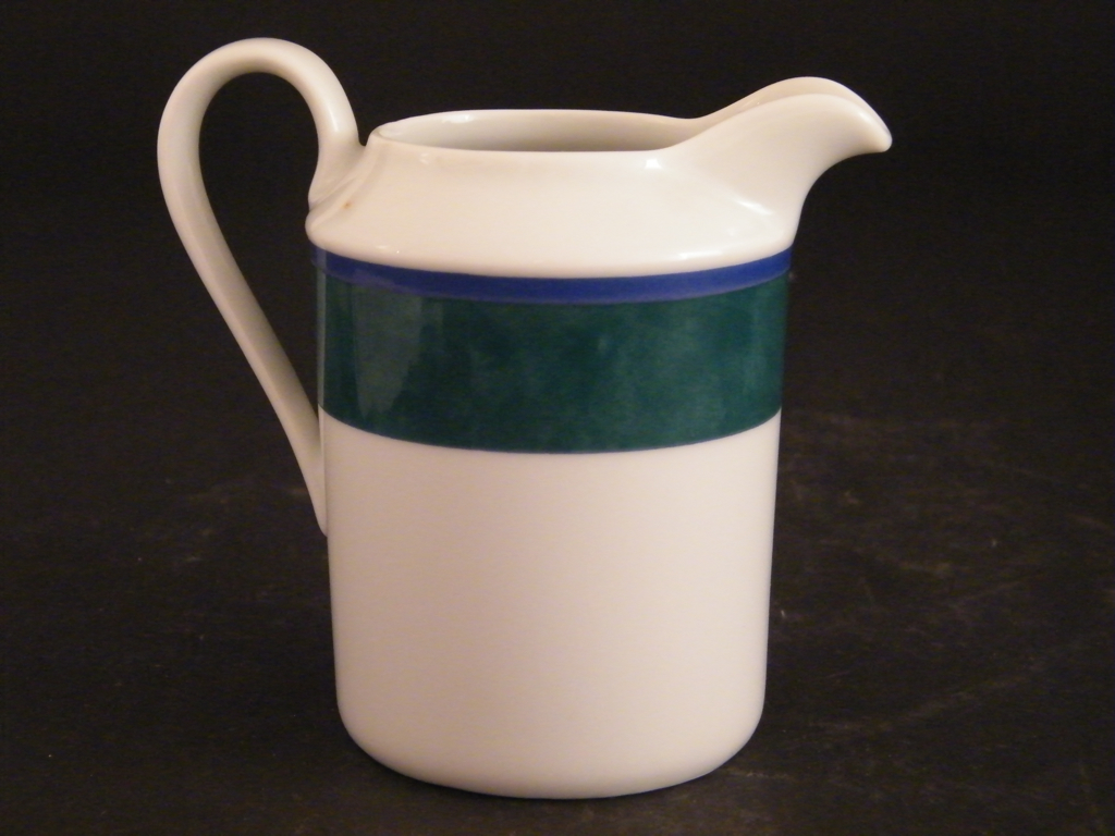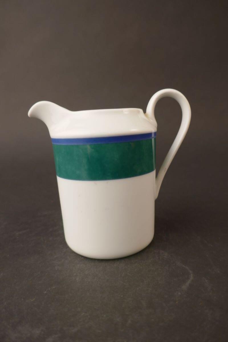 Pot avec un bec verseur et une anse, le corps cylindrique est composé d’une fine bande bleue et en-dessous une large bande verte.
