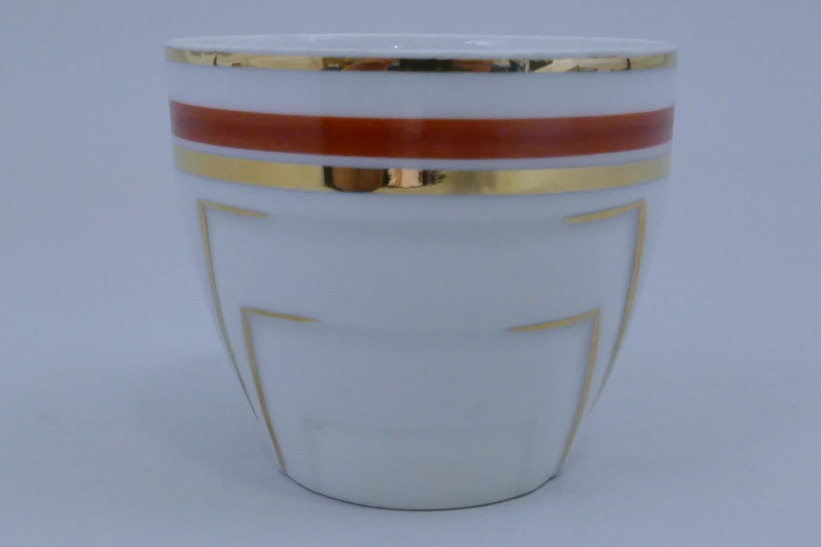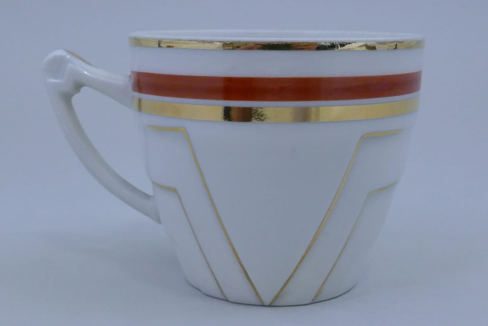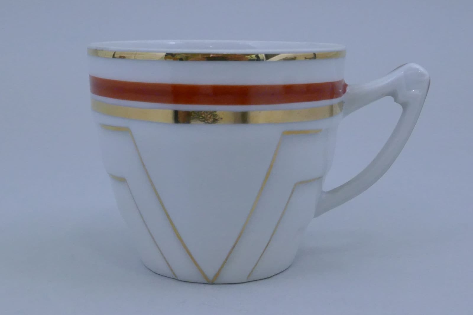 Tasse blanche, décor lignes géométriques couleur dorée et orange avec liseré or