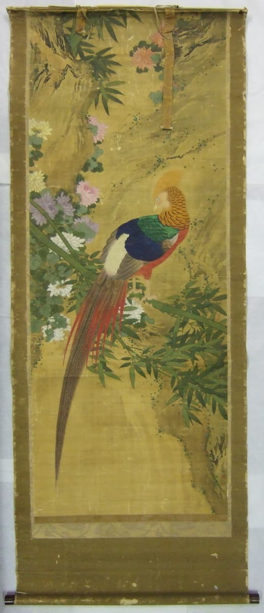 Peinture sur rouleau vertical représentant un faisan sur une branche de bambou avec des chrysanthèmes . (titre factice)