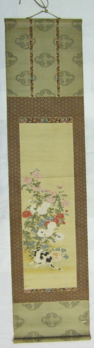 Peinture sur rouleau vertical représentant un couple de chats avec chrysanthèmes et asters. (titre factice)