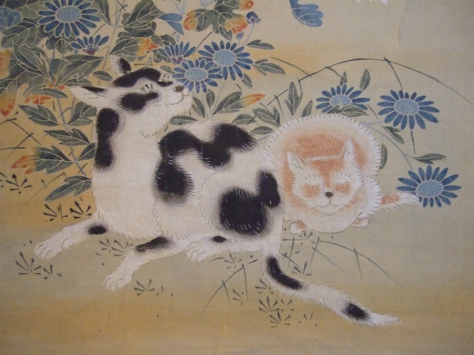 Deux chats dans des chrysanthèmes fleuris. Les numéros 12 [OA.COLL.1893.127] et 13 [OA.COLL.1893.128] se font pendants.(description Lansyer) Cette peinture verticale sur soie représente un couple de chat, l’un blanc tacheté de noir et l’autre roux, assis à l’ombre d’un bosquet d’asters et de chrysanthèmes. Ces deux fleurs représentent typiquement l’automne dans la culture japonaise. Remarque : tenchi présentant des motifs de nuages quadrilobés sur fond vert pâle, chûmawashi avec motifs floraux stylisés sur fond brun, ichimonji montrant sur fond noir des symboles chinois et bouddhistes.