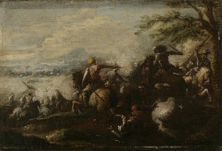 scène (bataille, charge, cavalerie) ; fond de paysage