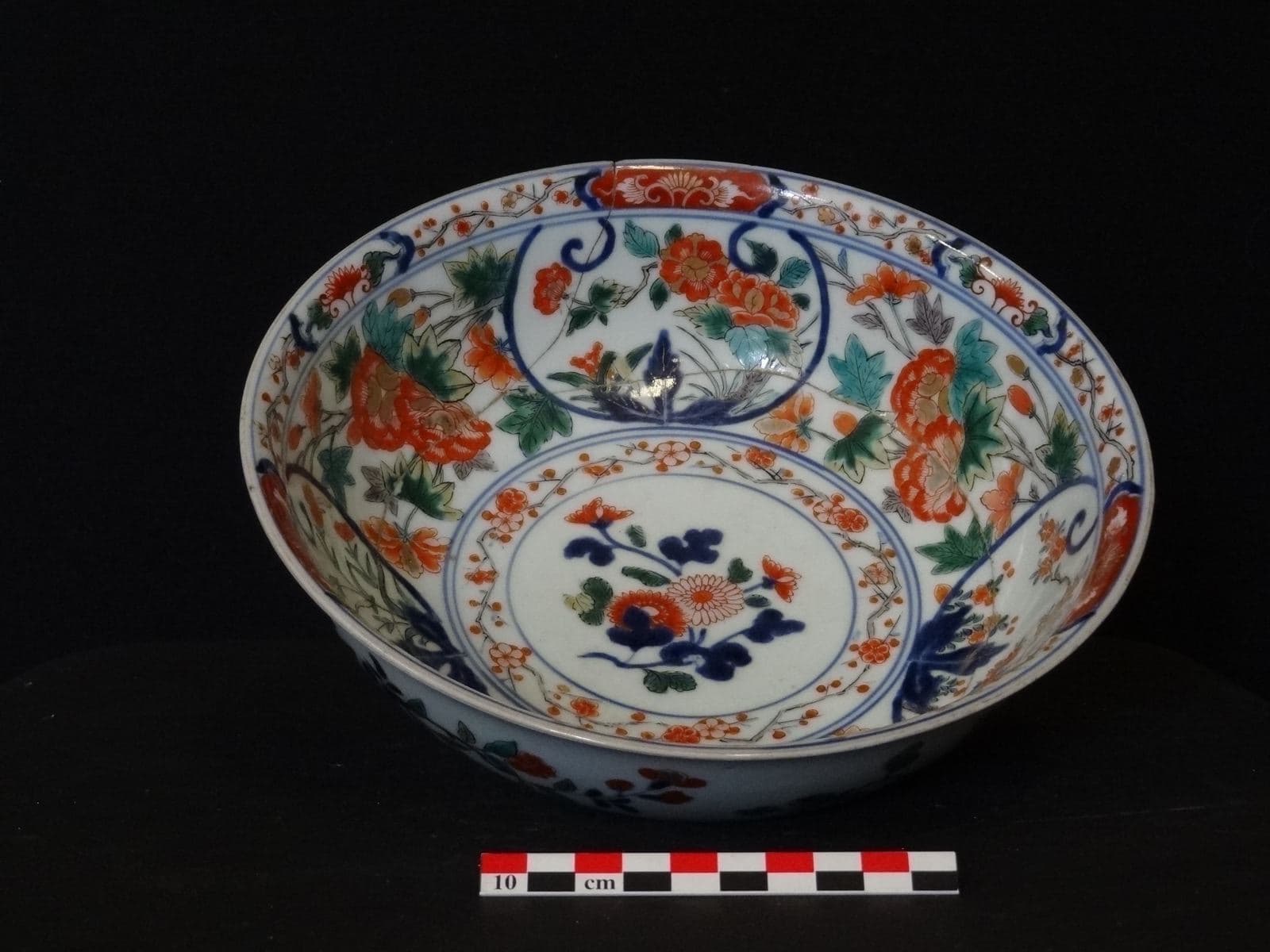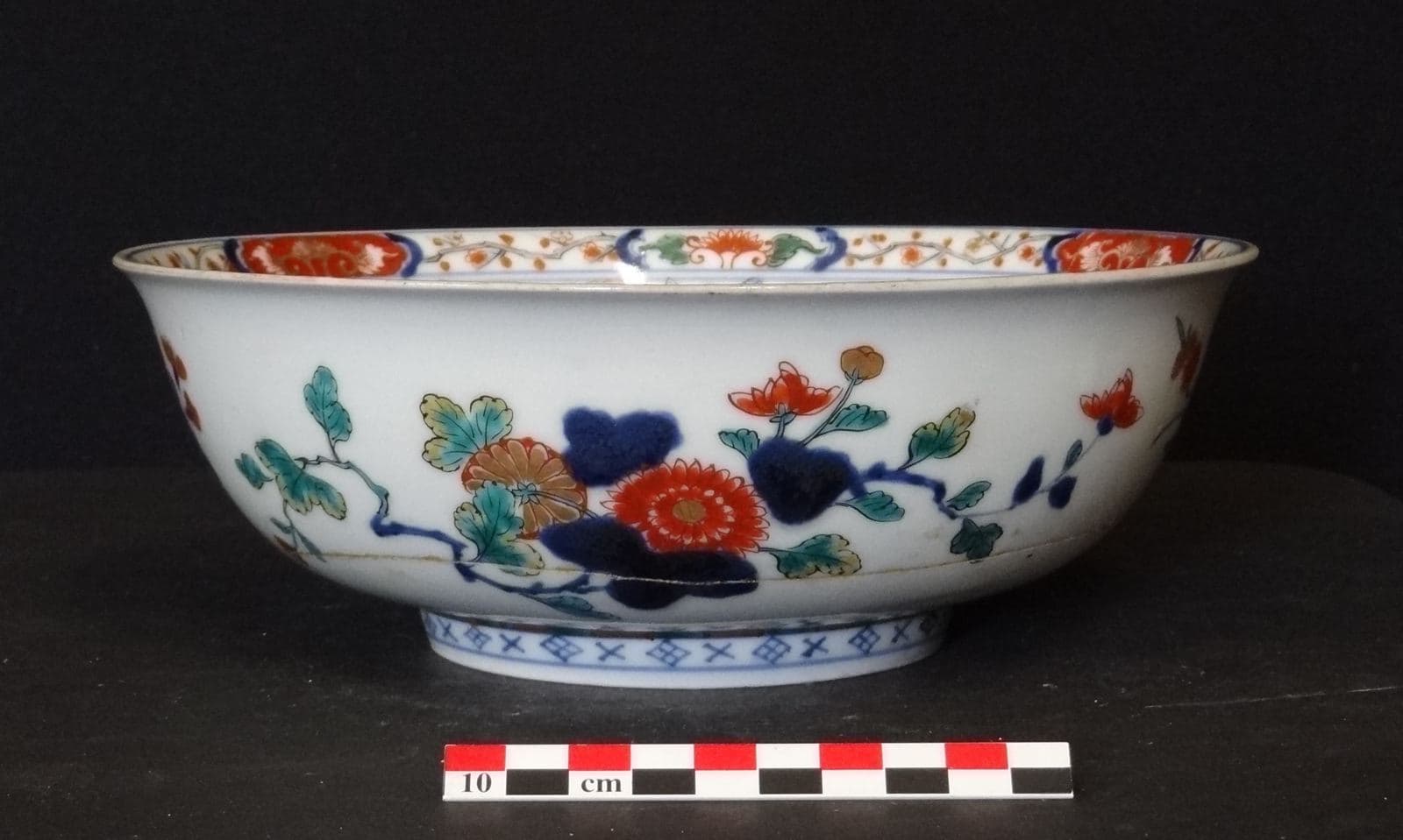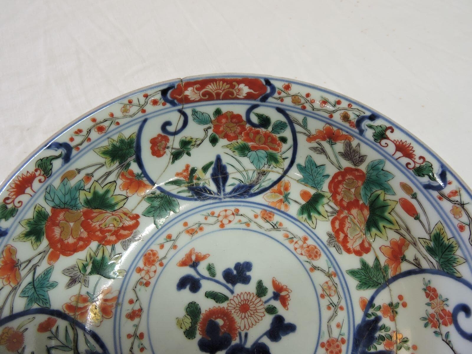 Chrysanthèmes en médaillon centrale sur réserve avec frise de branches de prunus en fleurs, grands rinceaux de pivoines occupant la descente et l’aile avec médaillons formant une tête de sceptre ruyi très stylisée avec une grande feuille au départ en bleu de cobalt sous couverte, frise de branches de prunus fleuries et petites réserves avec rinceaux de lotus stylisés au niveau de la lèvre. Le revers de la pièce est occupé par des branches de cerisiers en fleurs ainsi que des gerbes de chrysanthèmes et d’œillets peintes de manière très libre sur fond blanc. Le pied est souligné par une frise de pétales de lotus stylisés en rouge et vert ainsi que par une bande de motifs géométriques décoratifs en bleu de cobalt. Cette pièce semble appartenir à la sous-catégorie des Imari verts, proche des porcelaines avec décor d’émaux sur couverte de la famille verte qui se développent également sous le règne de Kangxi. Le bleu de cobalt sous couverte et la nature du décor, en revanche, sont Imari. ; Les premiers décors Imari sont réalisés au Japon et se distinguent par l’utilisation de l’oxyde de cobalt sous couverte. La pièce est ensuite plongée dans un bain de couverte transparente qui lui donne son aspect brillant et son imperméabilité. L’émail rouge est appliqué dans un second temps et l’or est ajouté en dernier et cuit à 680°C. Ce type de décor combinant le rouge safran, le bleu profond et le fond blanc de porcelaine rehaussé d’accents d’or est désigné sous le nom de kinrande (« brocard d’or »). Ce terme était utilisé à l’origine pour désigner les porcelaines chinoises de la fin de la dynastie Ming. Les premières porcelaines japonaises sont produites au début du XVIIe siècle dans la région d’Arita dans l’ancienne province d’Hizen, au sud de l’archipel. En 1658, tandis que les troubles entraînés par le changement dynastique en Chine entravent le commerce de la porcelaine, la Compagnie néerlandaise des Indes orientales se tourne vers le Japon. Les fours d’Arita élargissent leurs capacités : les commandes des classes supérieures japonaises, comme le style Nabeshima, se distinguent des productions destinées à l’exportation. Ainsi, les porcelaines expédiées vers l’Asie et l’Europe depuis le port d’Imari aux XVIIe et le XVIIIe siècles prennent le nom de Ko-Imari , « Imari ancien ». Dans les fours du sud du Japon se développe le style kinrande, très décoratif, floral et géométrique, destiné spécifiquement à l’exportation. L’utilisation de l’or est importante, surtout pour les détails les plus subtils sur des zones d’un bleu dense. La surface des pièces est divisée en plusieurs sections que l’on couvre entièrement de nombreux motifs, avec une forme d’« horreur du vide » qui n’existe pas dans les autres styles des porcelaines japonaises, comme le Kakiemon ou le Nabeshima. Le revers des pièces présente souvent une marque en forme de clou de girofle ou de chrysanthème, à l’imitation des porcelaines chinoises. Toutefois, les restrictions commerciales imposées par le gouvernement militaire d’Edo dans la baie de Nagasaki pèsent sur les exportations officielles de la Compagnie des Indes Néerlandaises. A partir de 1720, les fours chinois commencent à imiter le style des porcelaines d’Arita à des prix très compétitifs. On parle alors d’« Imari Chinois » qui, au même titre que les porcelaines à décor bleu et blanc ou les porcelaines de famille rose, font partie des pièces dites « de la Compagnie des Indes » spécifiquement produites pour l’exportation vers l’Occident. Le principe des trois couleurs dominantes, bleu rouge et or sur fond blanc, est respecté mais adapté à une iconographie plus chinoise. Certaines pièces présentent des variations de couleur, comme l’application d’émaux verts, jaunes et mauves, mais la présence de l’or reste un critère dominant. Les formes s’adaptent aux usages aristocratiques européens : services à café, à thé, à chocolat, gobelets et bouteilles pour les alcools, salières, saucières, articles de bureau, éléments de couverts, etc. La différence n’est pas évidente à faire entre les Imari japonais et les Imari chinois. Les indices sont : un doré plus bruni, plus foncé et appliqué avec moins de précision pour les Imari japonais du XVIIIe siècle ; un bleu de cobalt aux nuances indigo très profondes, proches du noir, appliqué avec une brosse épaisse pour les Imari japonais, lors que le bleu des pièces chinoises est plus clair, appliqué plus précisément et créé davantage de lavis ; l’émail rouge tire vers un orangé plutôt mat et épais, appliqué moins de précision pour les Imari japonais ; l’iconographie florale est plus ornementale, plus anonyme dans ses motifs sur les Imari chinois ; certains motifs auspicieux relevant davantage de l’iconographie chinoise pour les Imari de Jingdezhen, comme les Huit Choses Précieuses ou les Cent Antiquités ; la pâte des Imari chinois est plus fine et plus délicate ; les traces de pernettes (outils utilisés lors de la cuisson dans les fours) sont uniquement présentes sous la base des pièces chinoises.