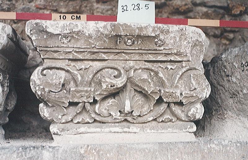 Chapiteau de pilastre à trois faces roman. La corbeille de la face principale est ornée de deux paires de rinceaux reliés par des bagues, l'une ornée d'un chevron, l'autre ornée d'anneaux. Les rinceaux du centre encadrent une palmette. Sur le tailloir court une frise de rubans pliés en chevron surmontés de trois petites roses.