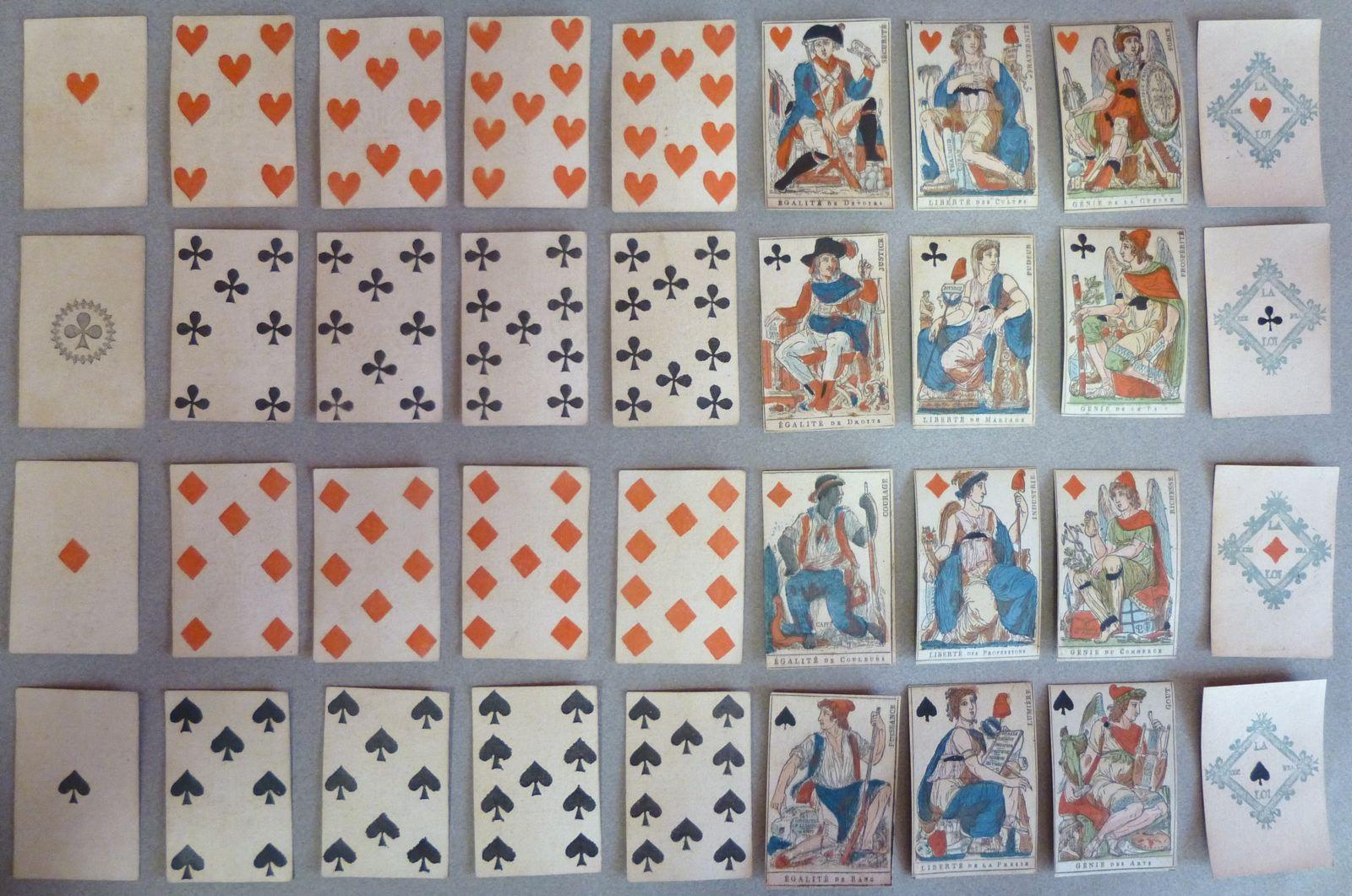 Jeu de piquet révolutionnaire créé par Jaume et Dugourc en 1793. Jeu complet (trente-six cartes), aux enseignes françaises, à coins carrés et dos blanc. Les figures traditionnelles (roi, dame, valet) ont été remplacées par des génies, des libertés et des égalités, symboles de l'oeuvre de la Révolution. Au-dessus, la loi (ancien as), est encadrée par quatre faisceaux de licteurs, signe romain de la justice. Un as supplémentaire par couleur, non décoré.