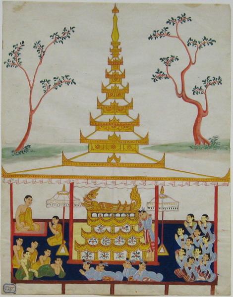 rite funèbre (convoi funèbre, cercueil, Asie du Sud-Est, bouddhisme, Bouddha, char, toit, animal fabuleux : chimère, ombrelle, arbre) ; groupes de figures (moine, homme, femme : prière, costume traditionnel)