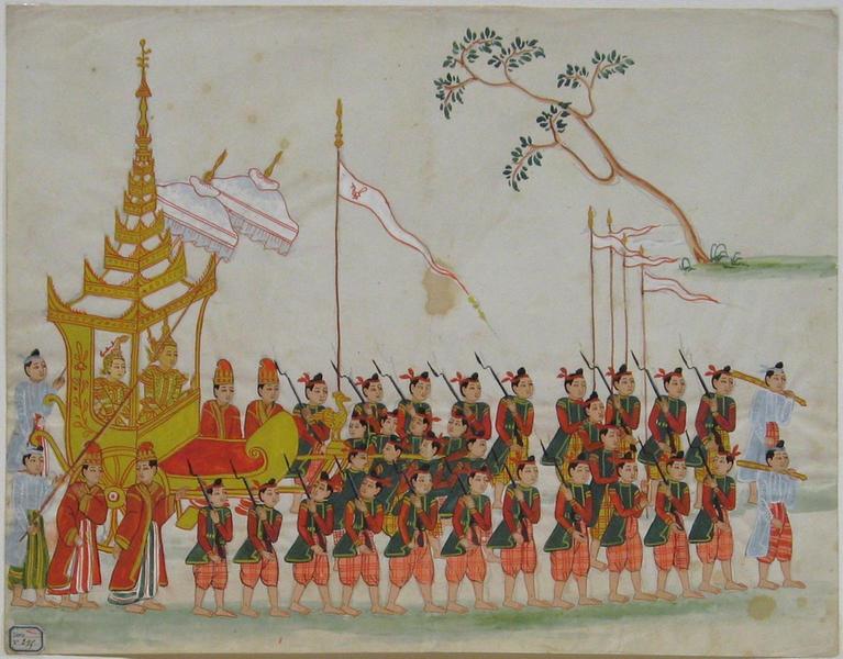 scène (procession, char : sculpture, paon, Asie du Sud-Est) ; groupes de figures (roi, reine, assis, ombrelle, soldat, turban, usnisa, costume traditionnel, étendard, fusil, homme : serviteur) ; fond de paysage (arbre)