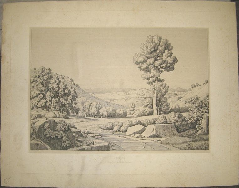 Mont Pentélique, Vue de l'une des sources du Pentélique, estampe de Théodore Aligny, inv. musée de Vendôme.
