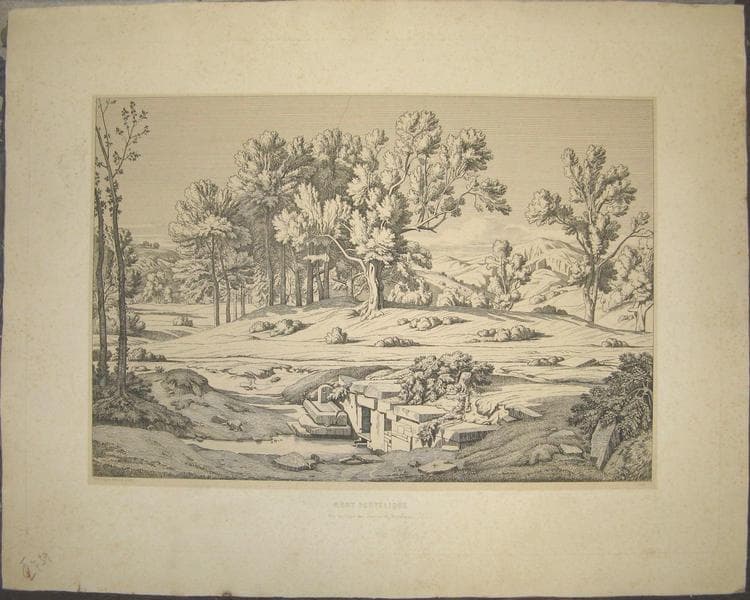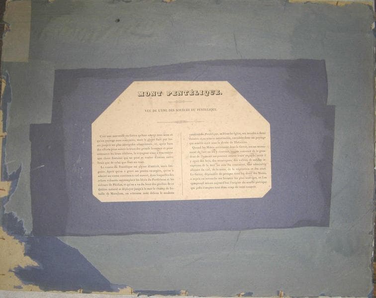 titre au recto : MONT PENTELIQUE / Vue de l'une des Sources du Pentélique. ; numéro d'inventaire ancien inscrit au recto : phi 739 ; numéro d'inventaire au verso : 2011.0.49 ; signé et daté au recto : Th(re) Aligny, delin et sculp / 1845 ; monogramme sur une pierre de la gravure :A T (entrelacées) ; inscription au verso sur un papier collé : MONT PENTELIQUE / VUE DE L'UNE DES SOURCES DU PENTELIQUE / C'est une merveille en Grèce qu'une source sans nom et / qu'un paysage sans souvenirs ; mais la gloire finit par las- / ser jusqu'à ses plus intrépides admirateurs, et, après bien / des efforts pour suivre la trace des grands hommes et pour / retrouver les lieux célèbres, le voyageur aime à rencontrer / une claire fontaine qui ne peut se vanter d'aucun autre / bruit que de celui que font les eaux. / La course du Pentélique est pleine d'intérêt, mais fati- / gante. Après qu'on a gravi ses pentes escarpées, qu'on a / admiré ses vastes carrières à ciel ouvert, dans lesquelles des / arbres robustes ont remplacé les blocs du Parthénon et les / colosses de Phidias, et qu'on a vu du haut des gradins de ce / théâtre naturel se déployer jusqu'à la mer le champ de ba- / taille de Marathon, on retrouve avec délices le modeste / couvent du Pentélique, sa blanche église, ses arcades à demi / ruinées et sa source intarissable, encadrée dans un paysage / qui semble écrit sous la dictée de Théocrite. / Quand les Musées arrivèrent dans la Grèce, aucun monu- / ment de l'art ne les y conviait, aucun souvenir de la gran- / deur de l'homme ne pouvait attirer leurs regards ; mais il / y avait des bois, des montagnes, des vallées, de subites ir- / ruptions de la mer au sein du continent, une admirable / alliance du ciel, de la terre, de la végétation et des eaux. / La Grèce, dépouillée de presque tous les dons des Muses, / a repris en revanche ses beautés les plus sauvages, et l'on / comprend mieux aujourd'hui l'origine du souffle poétique / qui jadis s'empara tout d'un coup de cette contrée.