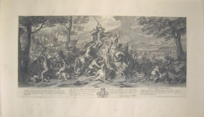 titre : LA VRAYE VALEUR EST TOUJOURS INVINCIBLE / Porus abandonné des siens blessa plusieurs de ceux qui / l'environnoient, tua le frère de Taxile, & apres ce dernier éfort / de courage il tomba luy même accablé de coups de dessus de son / Eléphant. , VIRTUS MORI MESCIA SORDIDI / PORUS destitutus a pluribus tela in circumfusos ingerens, / multis énimus vulneratis Taxilis fratem interemit. & hoc ul- / timo virtutis opere edito ipse novem vulneribus confossus- / ex Elephante dilabitur. ; signé : C. Le Brun in. , I. Audran ex. , A Paris chez B. Audran rau Palais du Luxembourg , et chez I. Audran a l'entrée du Faubourg S(t) Iâque vis a vis l'Ygret ; inscription : A Messire Julles Hardouin Mansart, Conseiller du Roy en ses Conseils, / Chevalier de l'Ordre de S(t) Michel, Comte de Sagonne, Sur-Intendant / et Ordonnateur general des Batimens, Jardins, Arts et / Manufactures de sa Majesté / Par son humble et tres obéissant / Serviteur I. Audran ; numéro d'inventaire : 2011.0.165