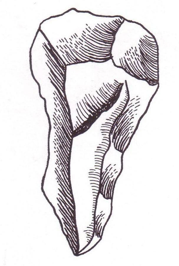 Tranchet : Instruments généralement triangulaires dont l’un des côtés présente une partie coupante formée par la rencontre en biseau de deux pans d’éclatement. Ces pièces pouvaient être emmanchées et être utilisées pour le travail du bois.