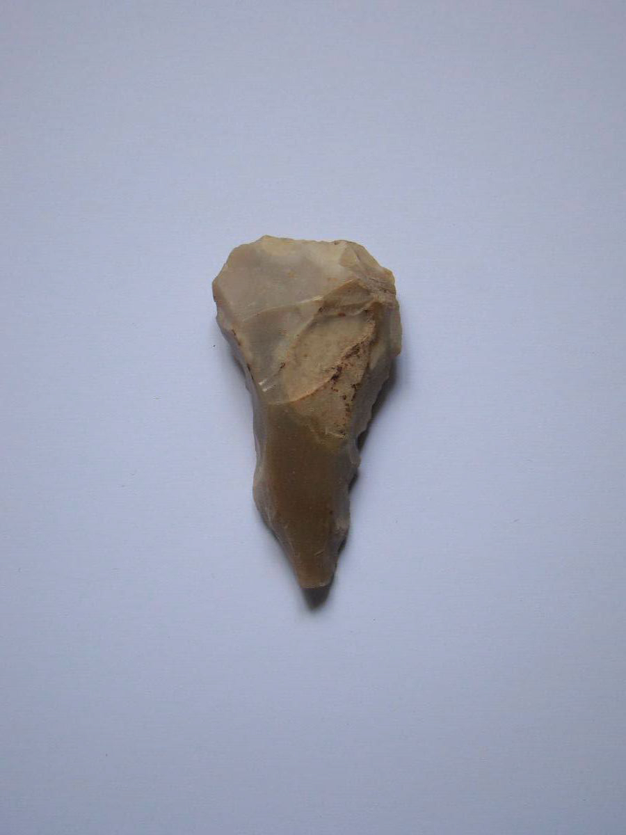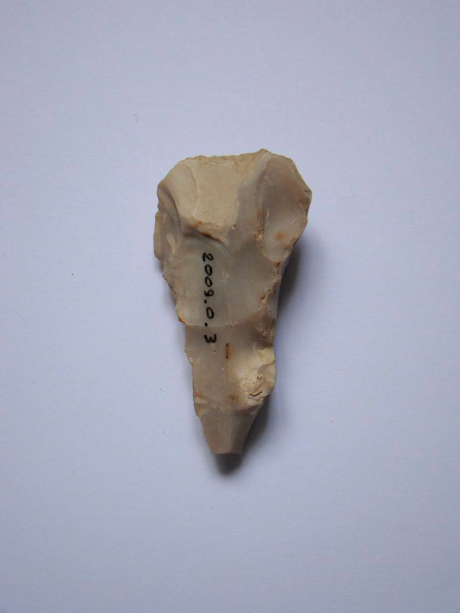 Silex taillé, de forme triangulaire : la partie la plus large sert à la découpe ; la partie la plus pointue sert de maintien