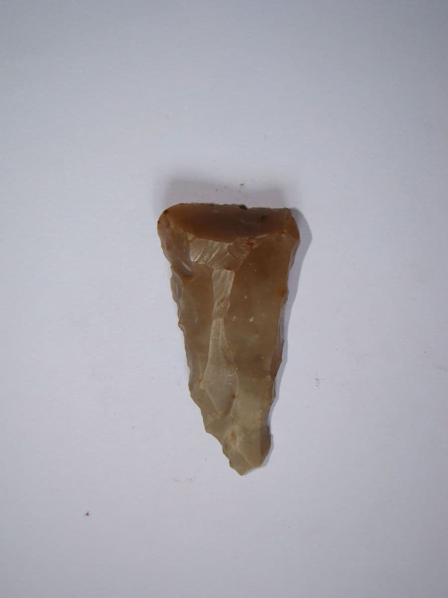 Silex taillé, de forme triangulaire : la partie la plus large sert à la découpe ; la partie la plus pointue sert de maintien