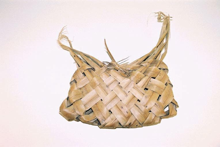 sac en feuilles tressées de forme rectangulaire. Les deux bords se rejoignent en points aux deux extrémités. Le haut de chaque bord comporte un petit noeud décoratif