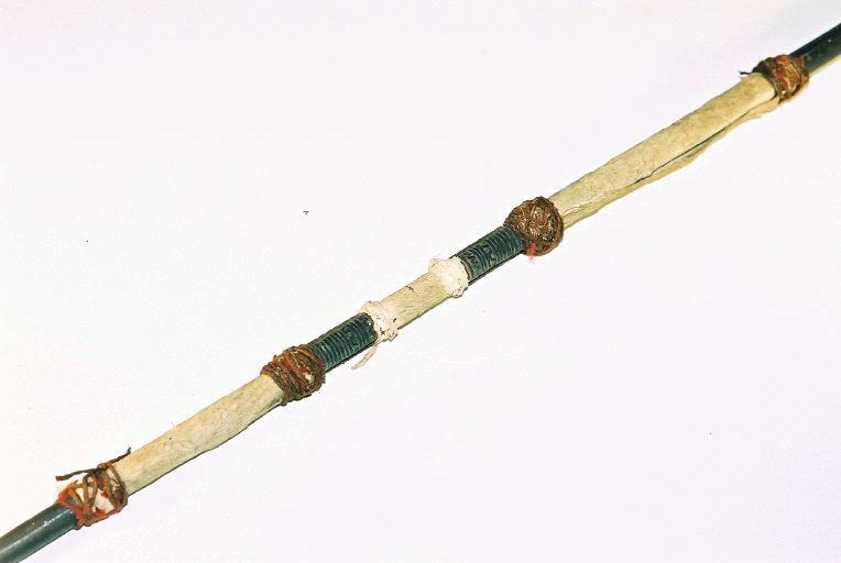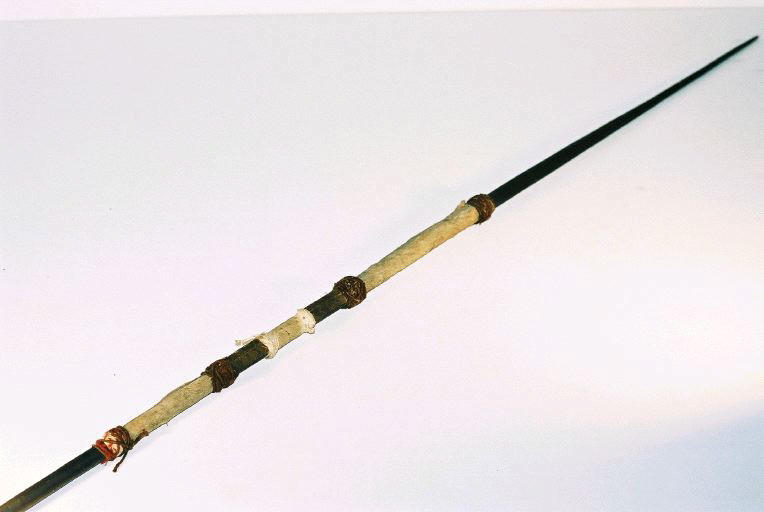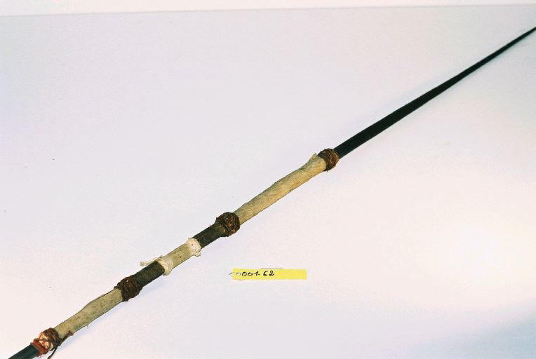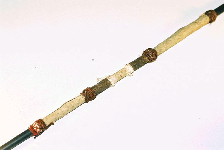 Sagaie à plaquette. La plaquette en bambou est recouverte d'une fine sparterie en partie enroulée dans du tapa blanc, le tout maintenu par des cordonnets en poil de roussette qui forment de chaque côté de la plaquette deux bourrelets sculptés