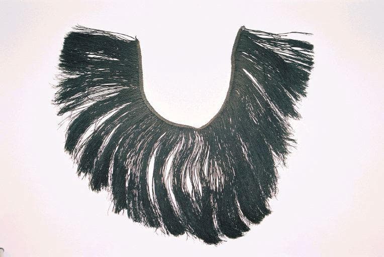 Morceau de frange composé d'une tresse en fibres teintes en noir, d'où pendent des fibres tressées en fines cordelettes interrompues aux 2/3