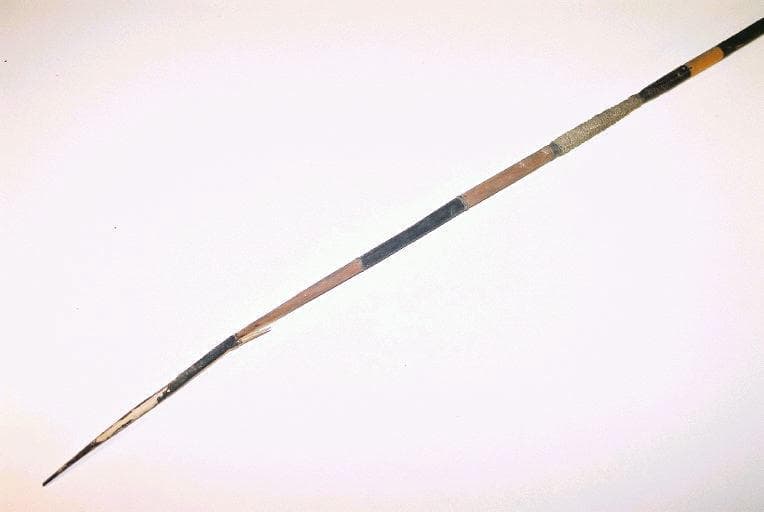Sagaie dont le manche est en bambou bicolore. Une lame de bois bicolore est fixée au manche par des ligatures en fibres. une pointe en os termine l'ensemble. Celle-ci est fixée à la lame en bois par des ligatures en fibres recouvertes d'une pâte végétale (?) noircie. Ces ligatures fixent également un ergot court en os dont la pointe est dirigée vers le manche