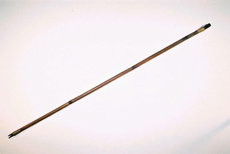 Sagaie utilisée comme flèche dont le manche est en bambou. La partie distale est formée de 2 petites plaquettes de bois devant enserrer un éclat de silex (perdu), le tout maintenu par des ligatures en fibres