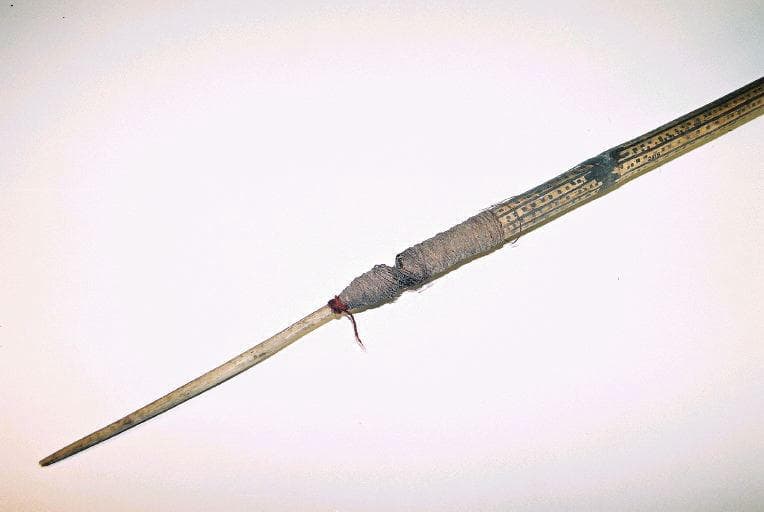 Sagaie à section transversale circulaire composée d'un manche en bambou comportant un décor de lignes dans le sens longitudinal et de points remplissant les espaces entre les lignes. Une lame en os compose la partie distale. Elle est reliée au manche par des ligatures en fibres