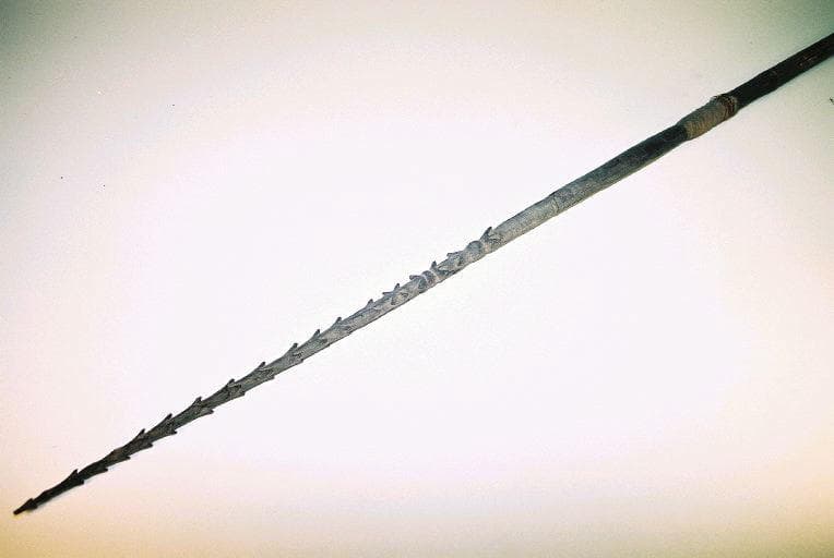 Sagaie à section transversale circulaire composée d'un manche en bambou et d'une lame en bois fixée au manche par des ligatures en fibres. Le manche est décoré dans le sens longitudinal de lignes continues et de points dans les espaces entre les lignes. la lame est décorée de motifs sculptés ressemblant à des noeuds et de barbelures