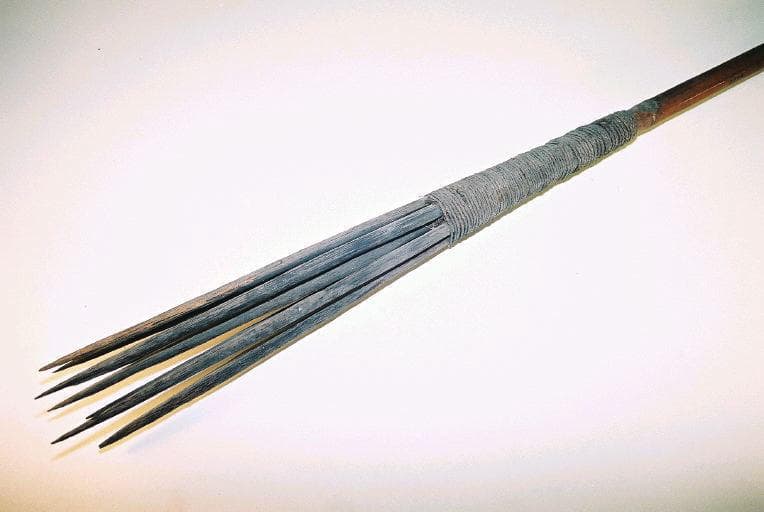 Foène à section transversale circulaire dont le manche est en bambou. La partie 6 distale est composée de 8 branches en bois fixées au manche par des ligatures en fibres. Extrémité du manche lacunaire. Pas de décor sur le manche