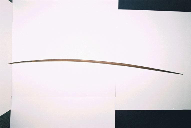 Arc dont le corps est en bois à section transversale semi-circulaire. La corde en fibres est manquante. Petit clou en fer planté sur la face plane du corps