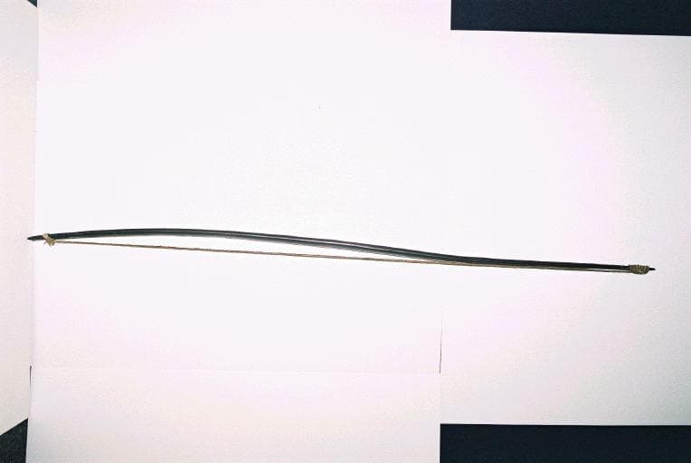 Arc dont le corps est en bois à section transversale semi-circulaire. La corde en fibres torsadées est fixée sur le corps par un système de noeuds