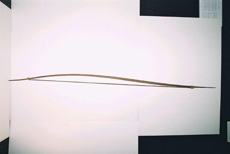Arc dont le corps en bois est à section transversale semi-circulaire. La corde en fibres torsadées est fixée sur le corps par un système de noeuds
